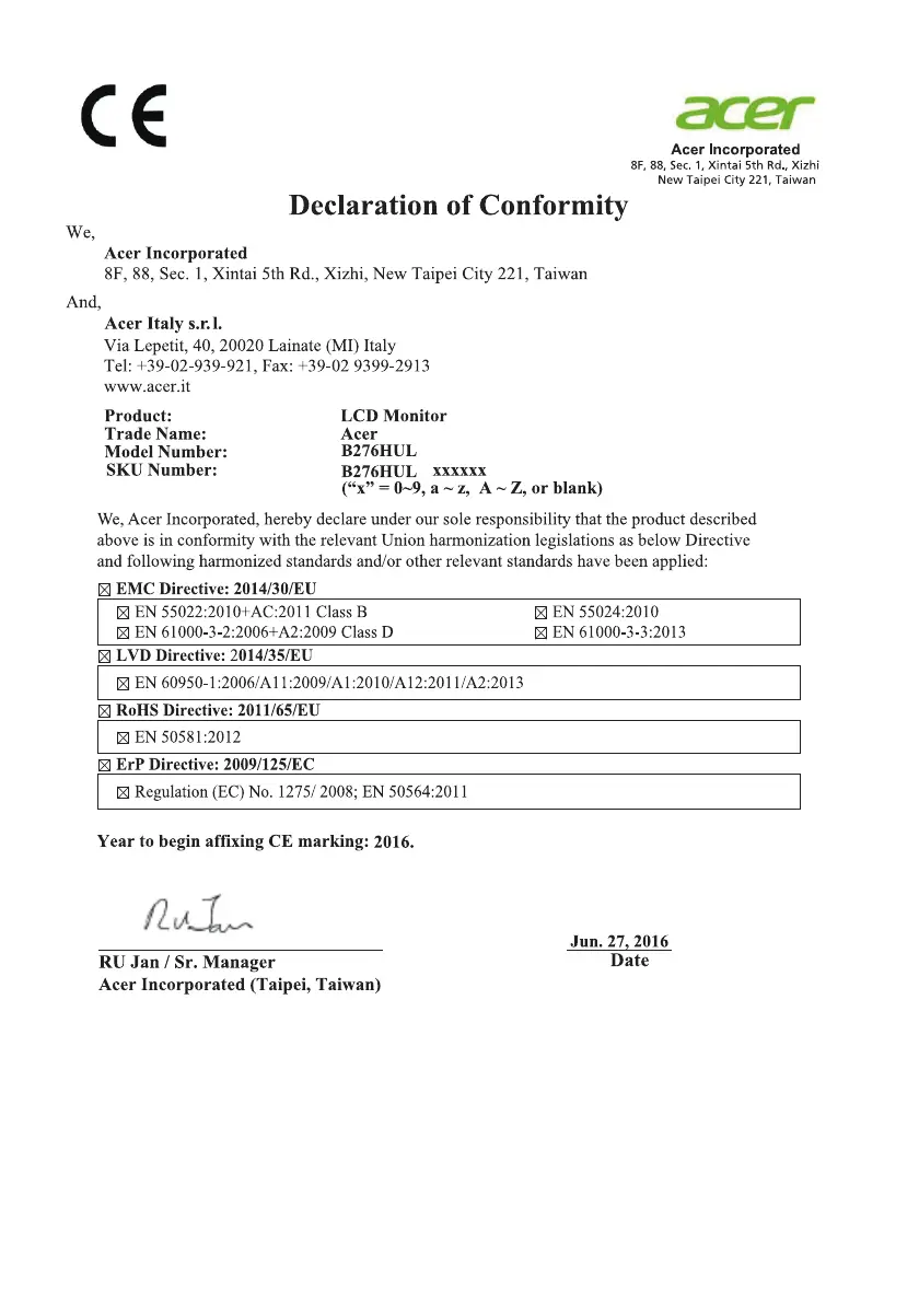 Bekijk gratis de handleiding van Acer B276HULE, stel vragen en lees de antwoorden op veelvoorkomende problemen, of gebruik onze assistent om sneller informatie in de handleiding te vinden of uitleg te krijgen over specifieke functies.