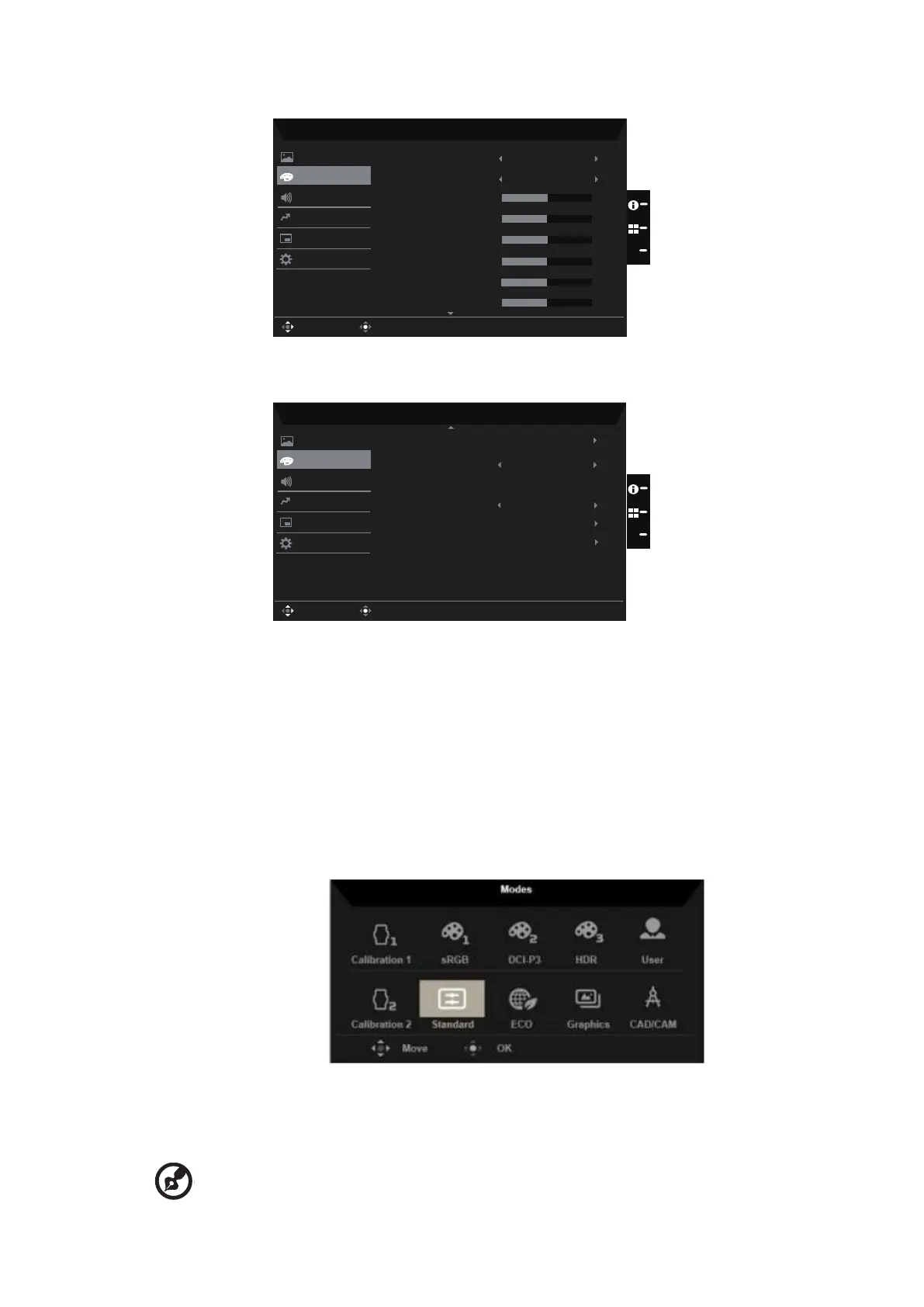Warm: verhoogt de kleurtemperatuur. Het scherm verschijnt warmer met een roodgele tint. Dit is de standaard
