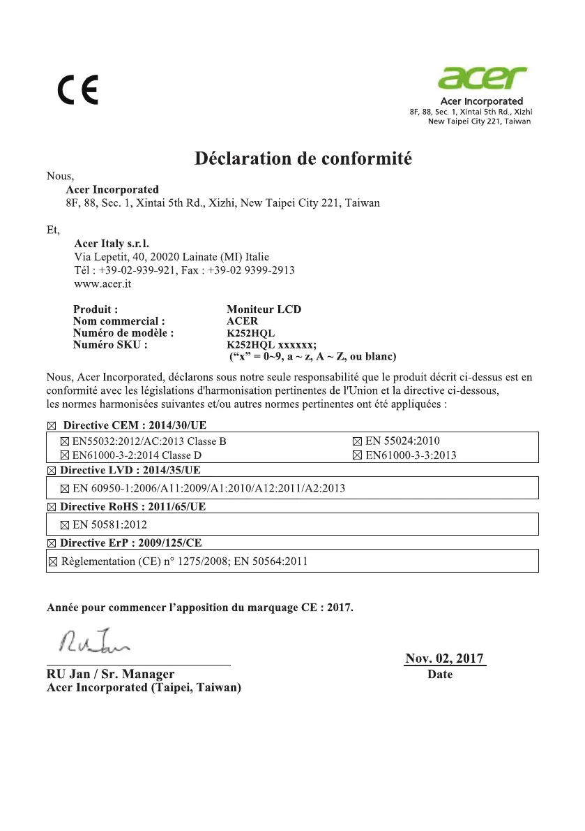 Bekijk gratis de handleiding van Acer K252HQL, stel vragen en lees de antwoorden op veelvoorkomende problemen, of gebruik onze assistent om sneller informatie in de handleiding te vinden of uitleg te krijgen over specifieke functies.