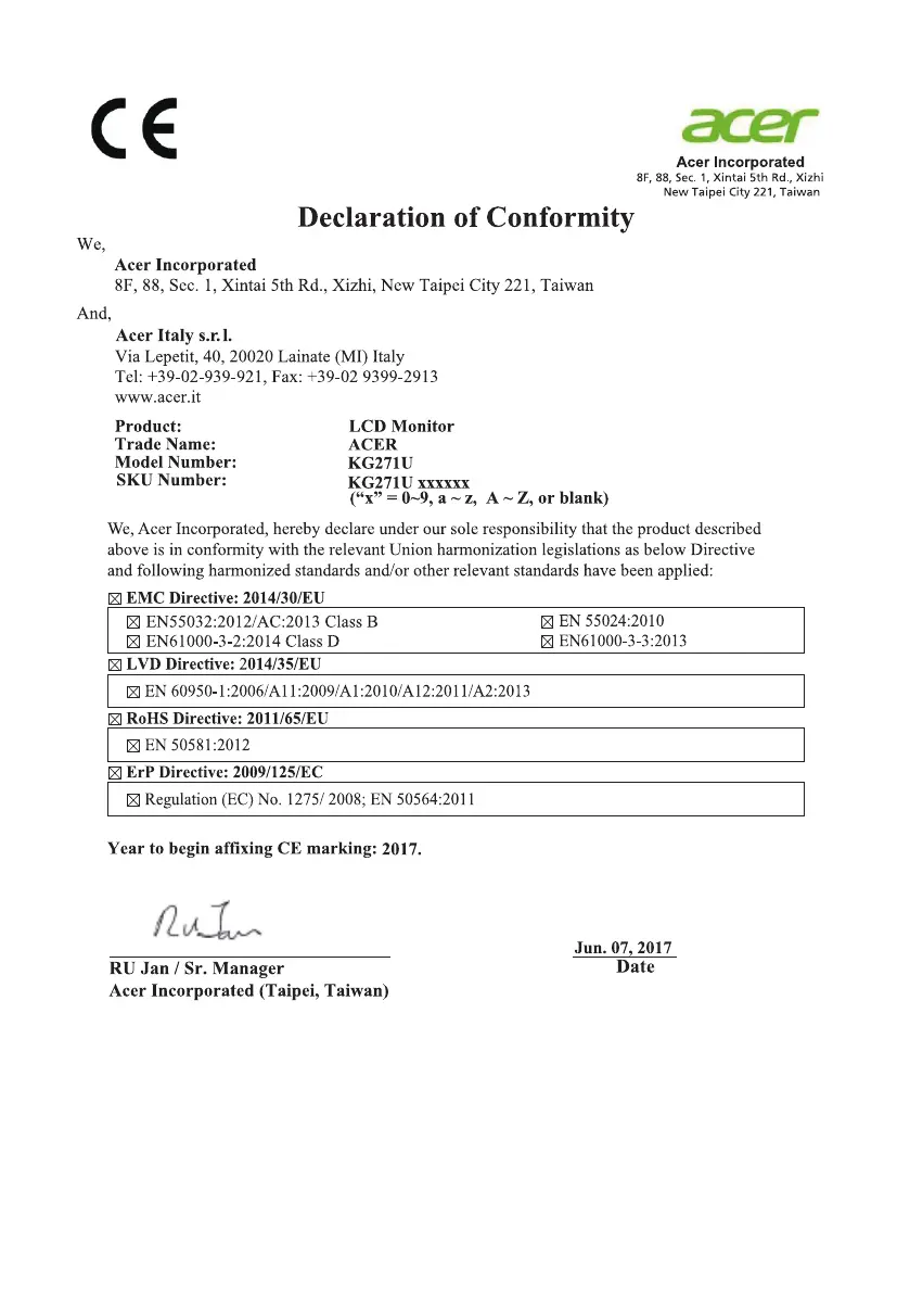 Bekijk gratis de handleiding van Acer KG271U, stel vragen en lees de antwoorden op veelvoorkomende problemen, of gebruik onze assistent om sneller informatie in de handleiding te vinden of uitleg te krijgen over specifieke functies.