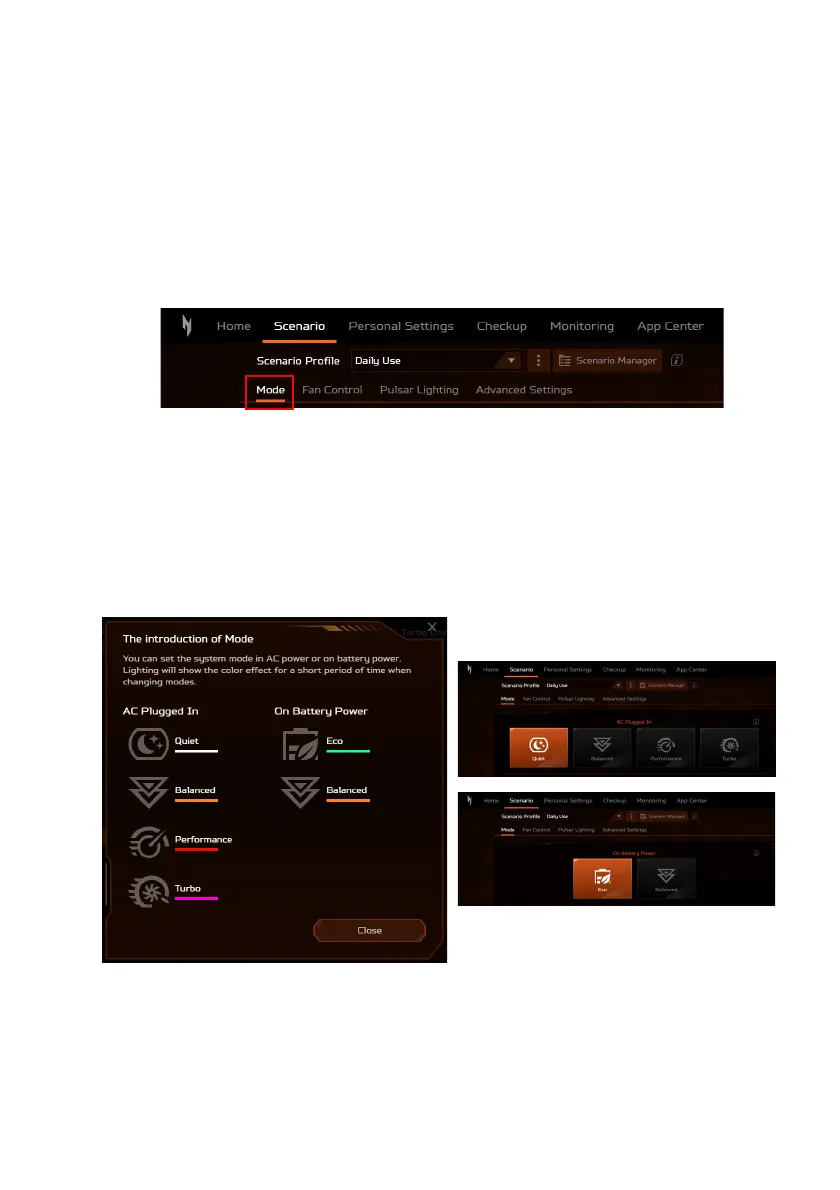 (Gebalanceerd), [Performance] (Prestaties), Turbo en Eco. Elke