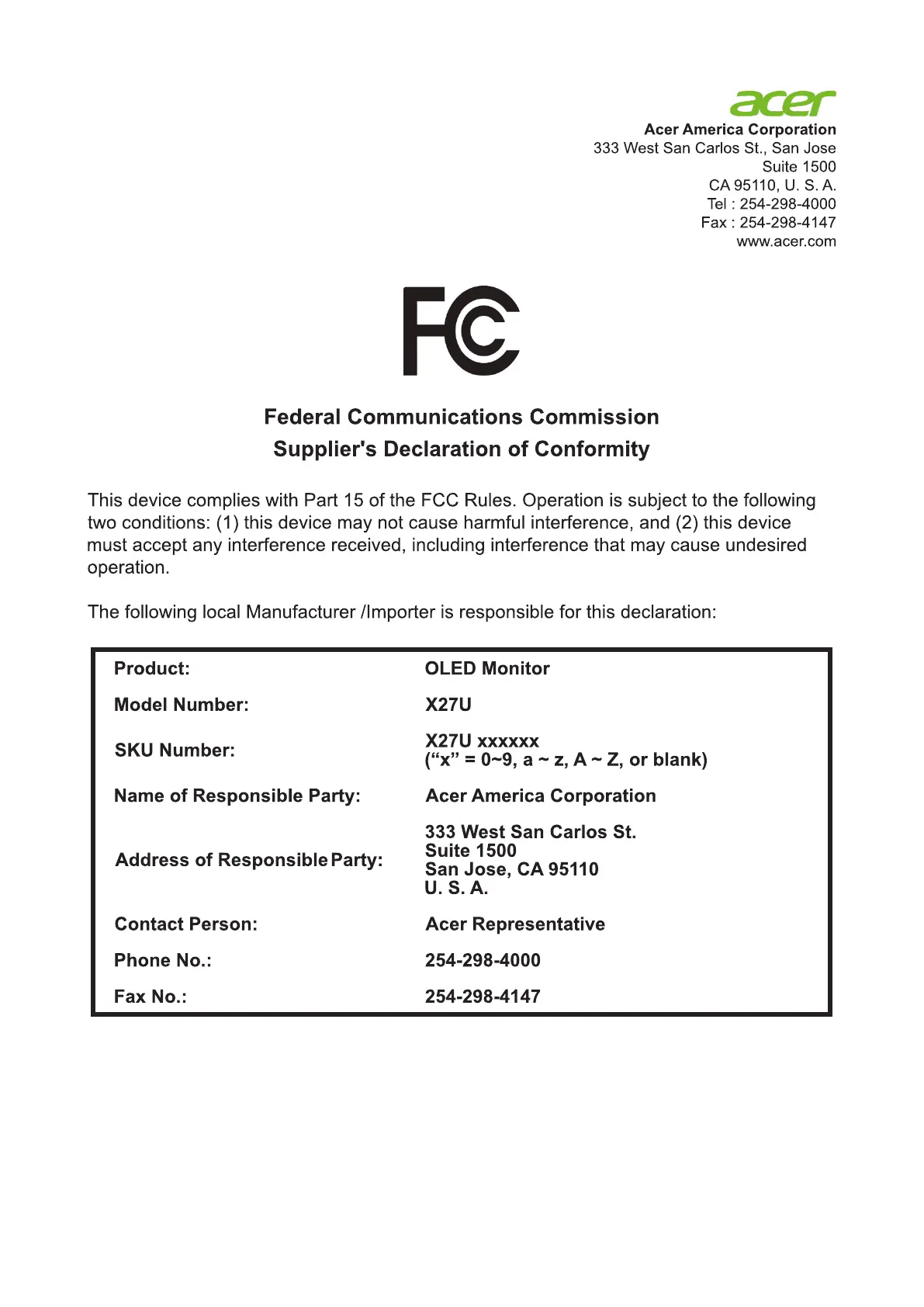 We, Acer Incorporated, hereby declare under our sole responsibility that the product described above is in