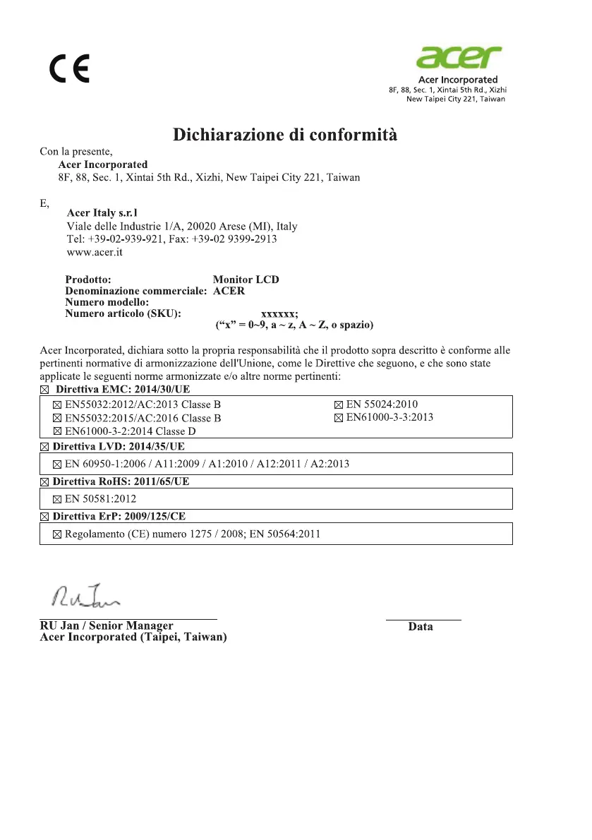 Anno per iniziare l'apposizione della marcatura CE: 2019.