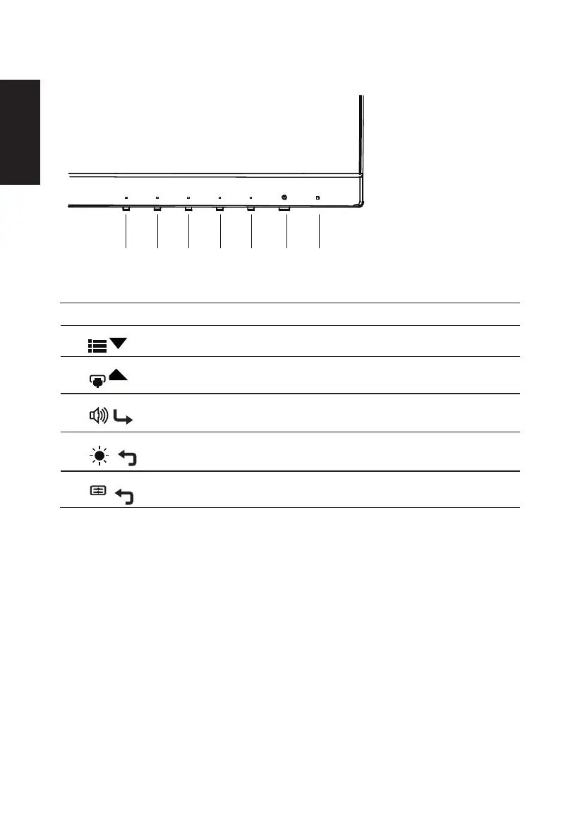 1&2 Power button Turns the monitor on/o.Blue indicates power on. Amber indicates standby/ power saving
