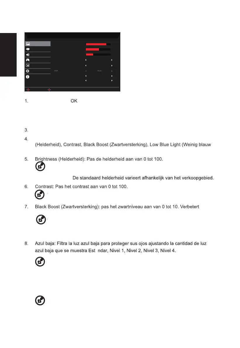Het menu Beeld kan worden gebruikt voor het aanpassen van de Brightness