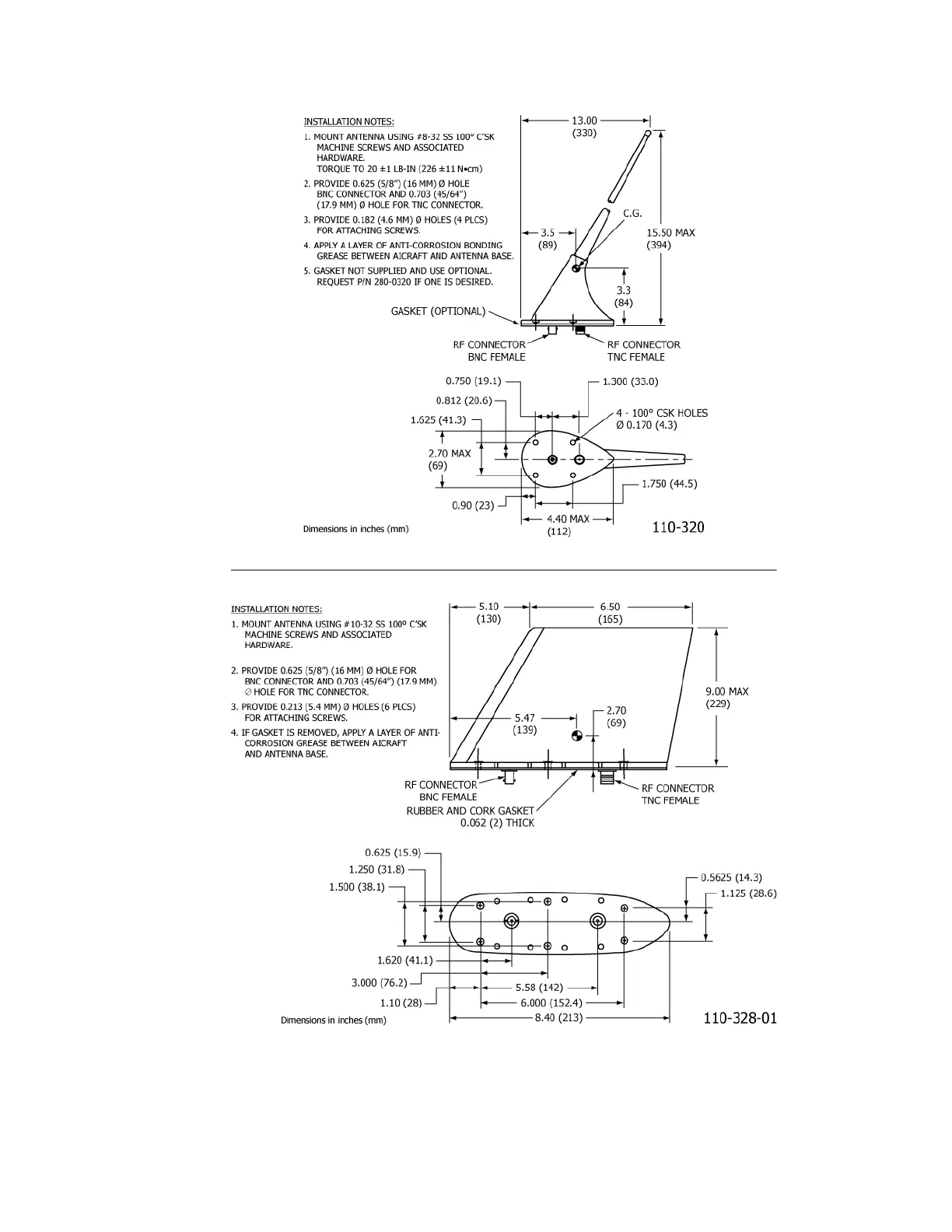 Figure 16 Rod Antenna 110-320 and Blade Antenna 110-328-01 Outlines and Dimensions
