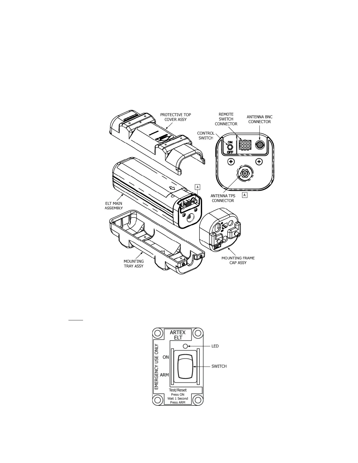 2) The cockpit-mounted remote switch assembly is comprised of an ELT status LED and control switch and
