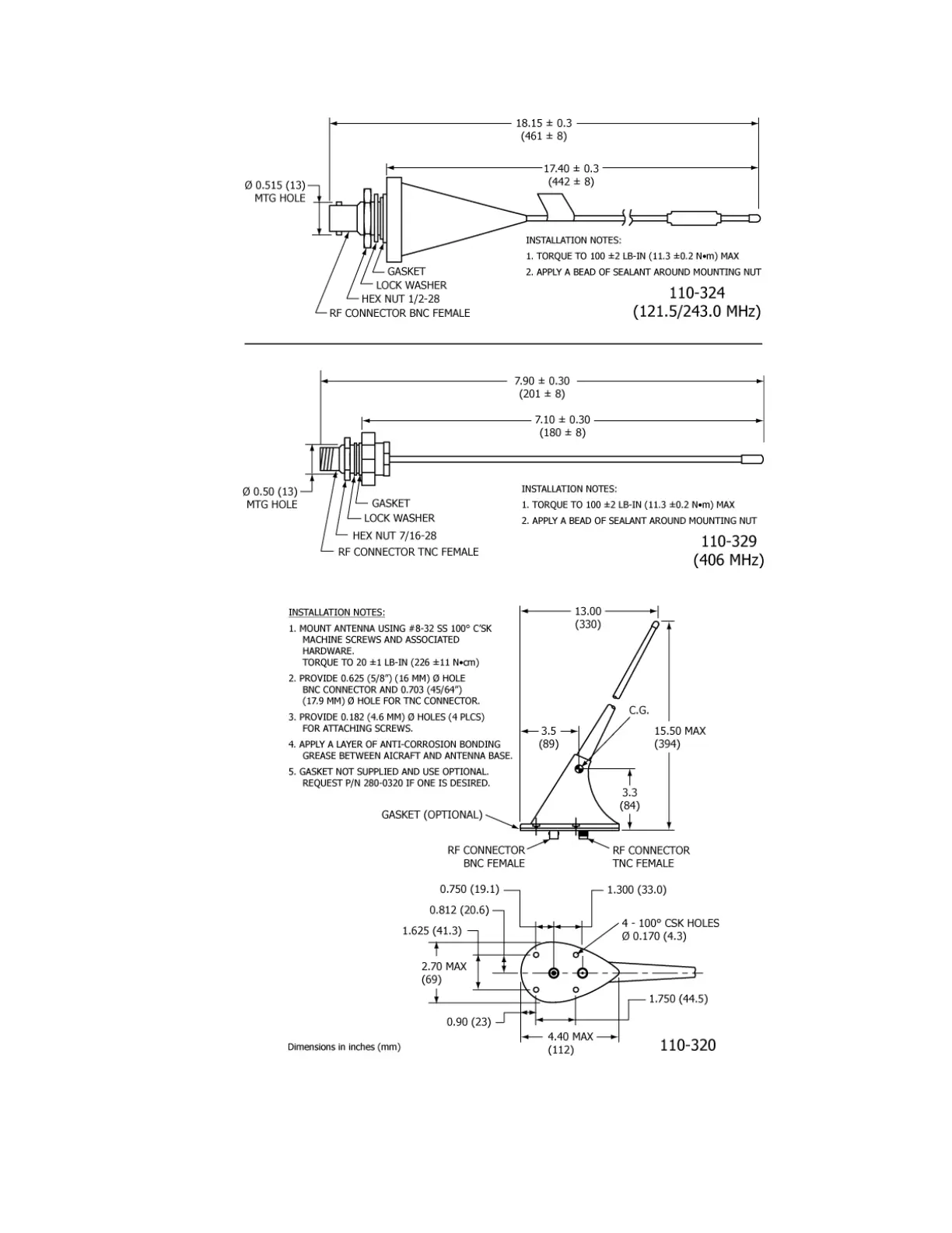 Figure 14 Whip Antennas 110-324 and 110-329 Outlines and Dimensions