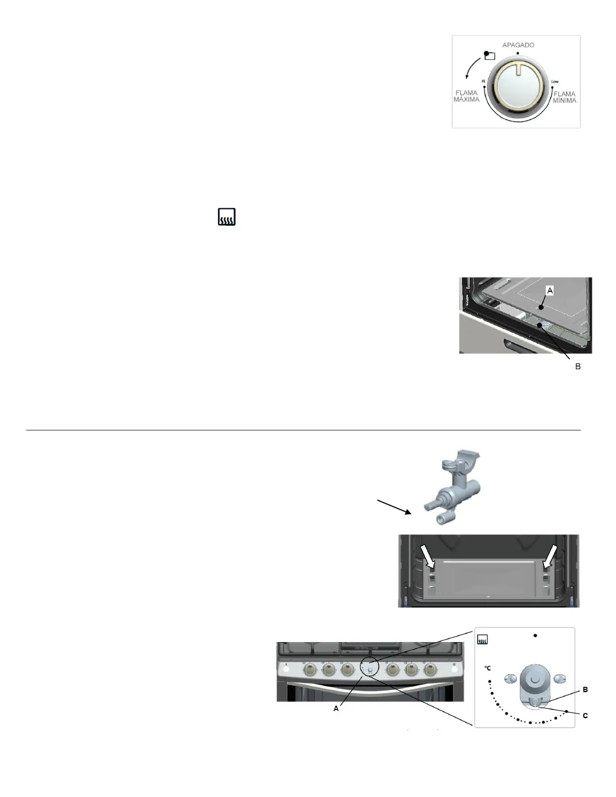 2. Turn on the oven burner as explained on section “Oven Burner” and “Model with electronic ignition thermostat”. Remove the knob and