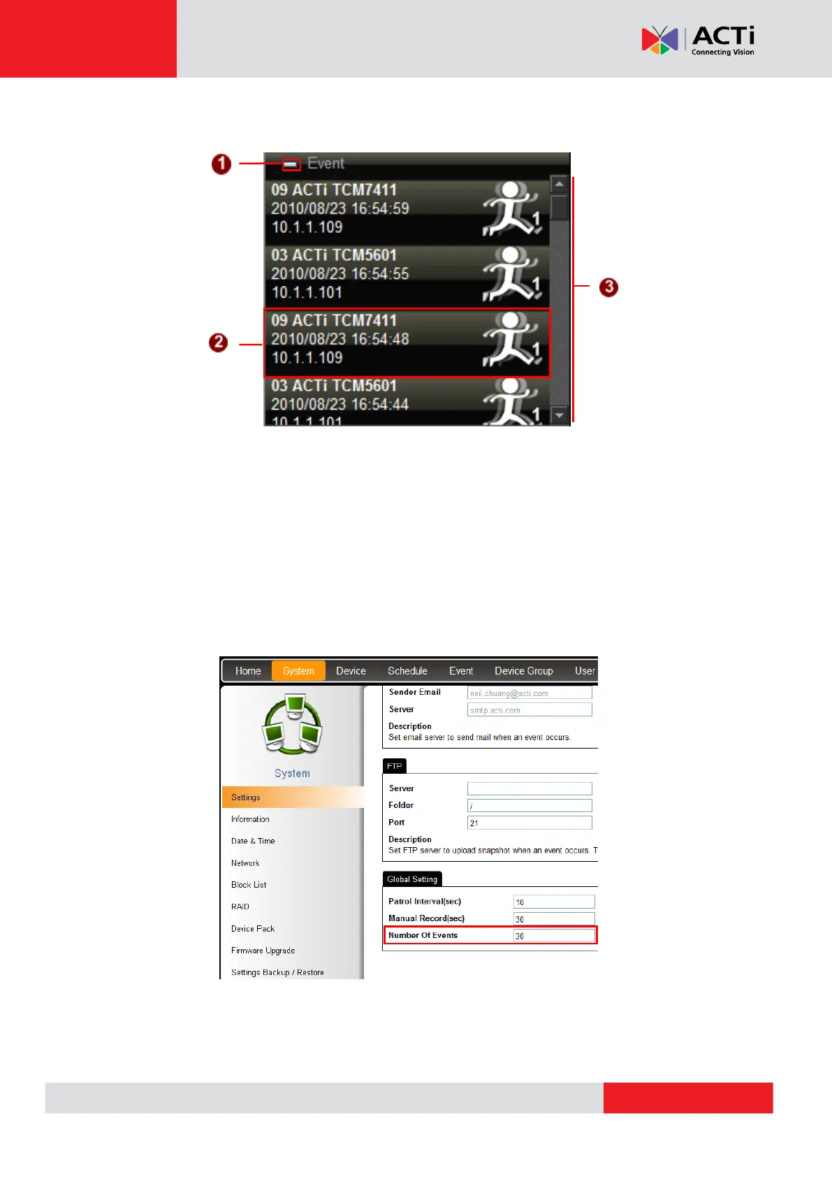 2. Event information: This shows the type of event by an icon, camera ID, IP address and