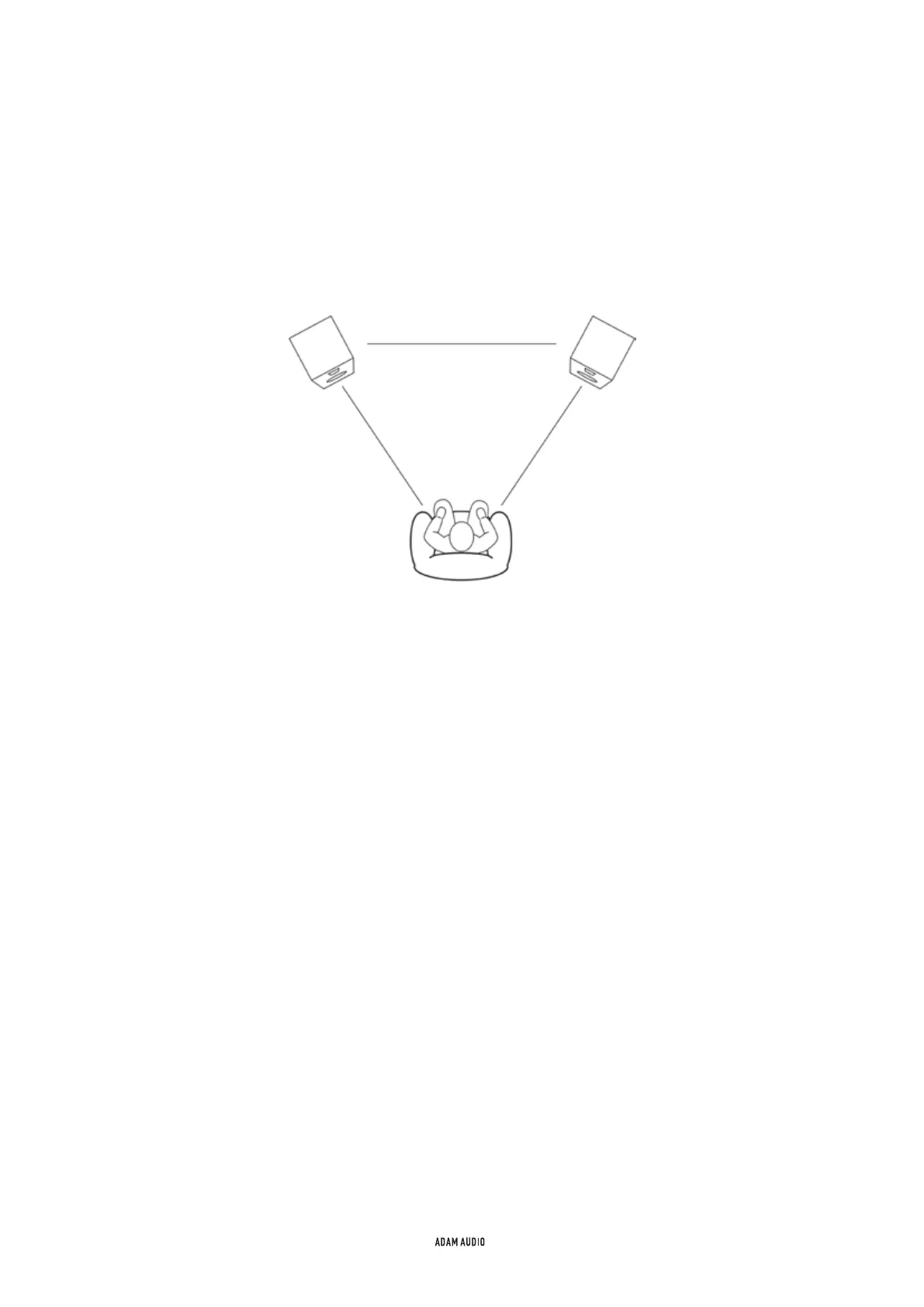 one corner of an equilateral triangle, with the two speakers at the other corners
