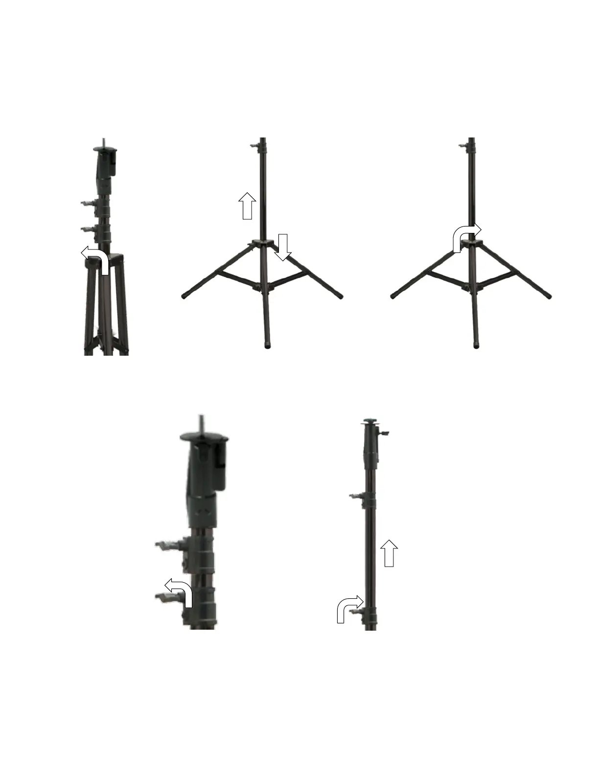 Loosen Knob D by turning it counter clockwise. Spread the legs by pulling up on the outer pipe until