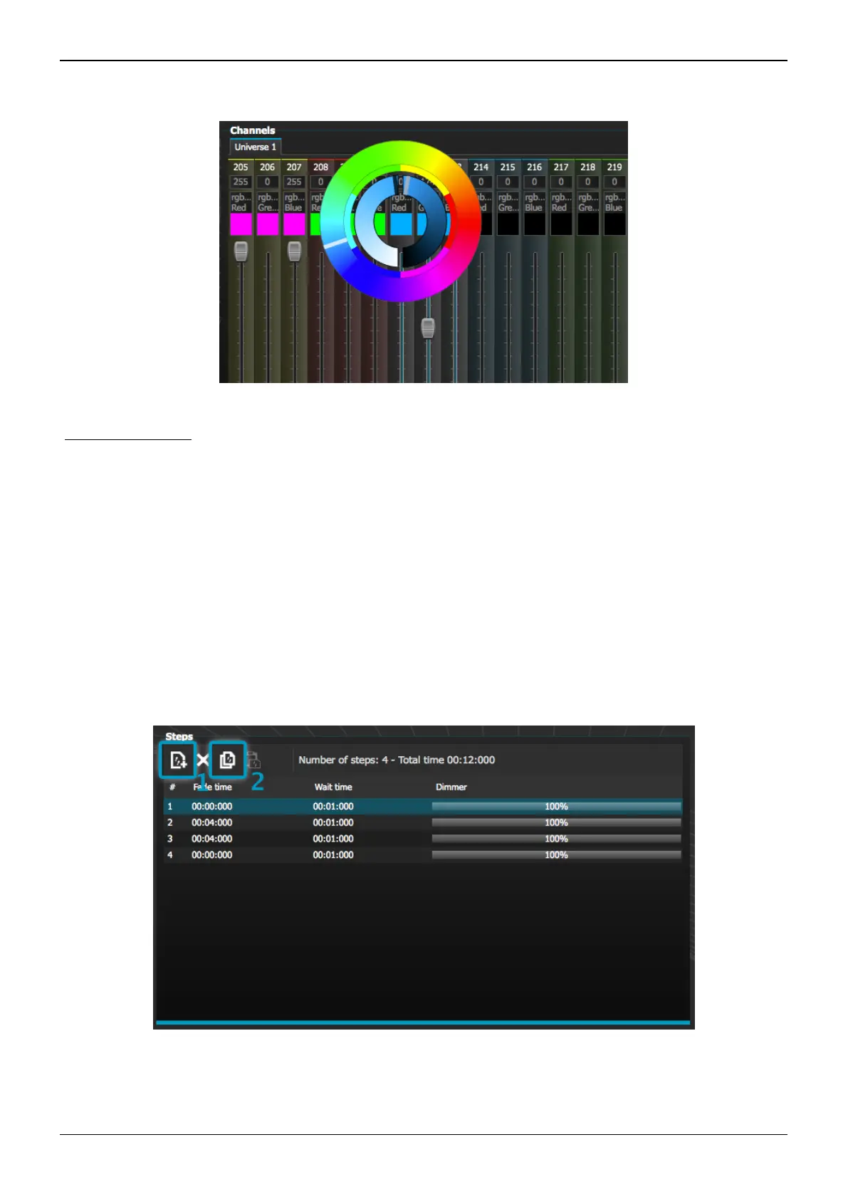 each channel. Several steps make up a scene. Scenes can be created by clicking the top left icon in