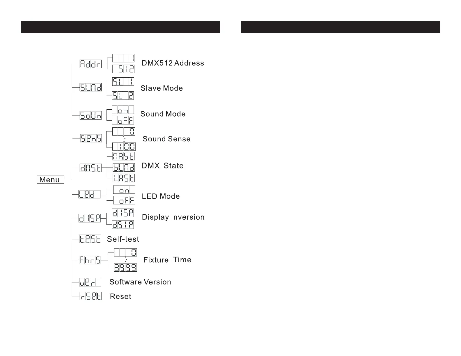 into DMX mode, press and hold the MENU button for at least 3 sec-