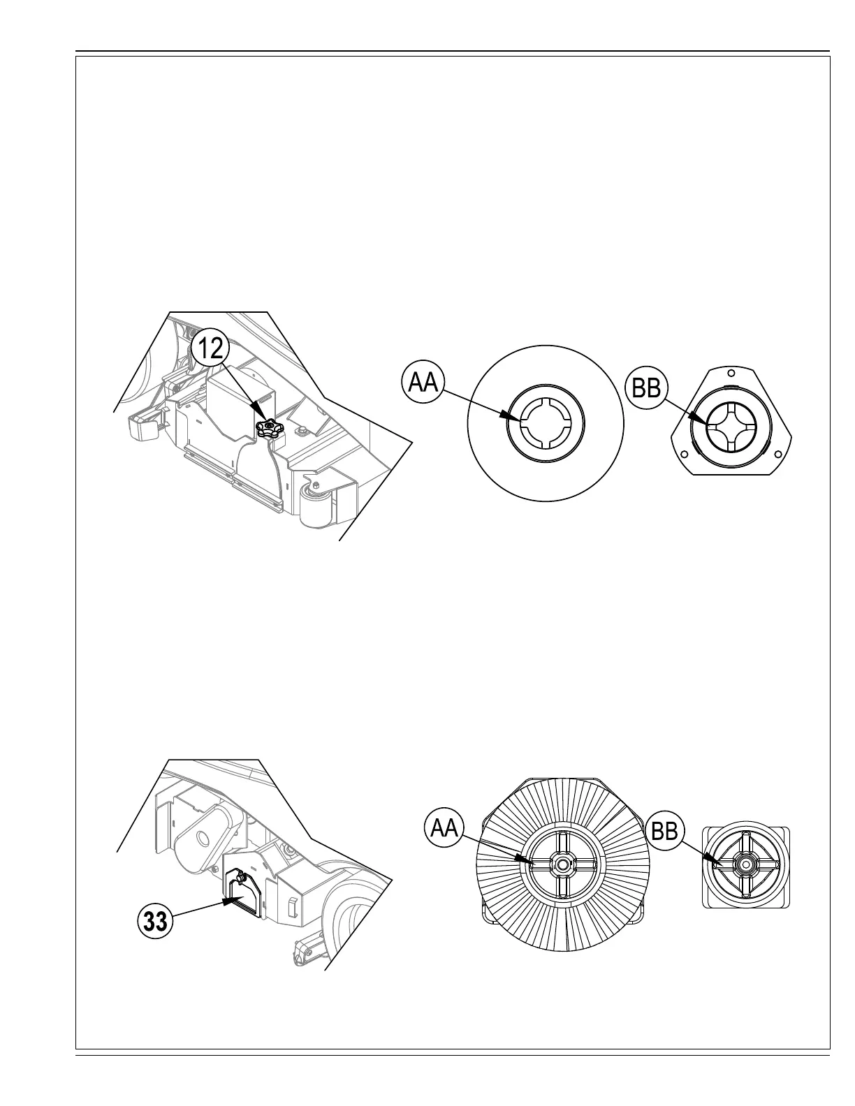 on Lugs (BB) on the Drive End Assembly. Re-install the idler assembly and tighten Knob (12).