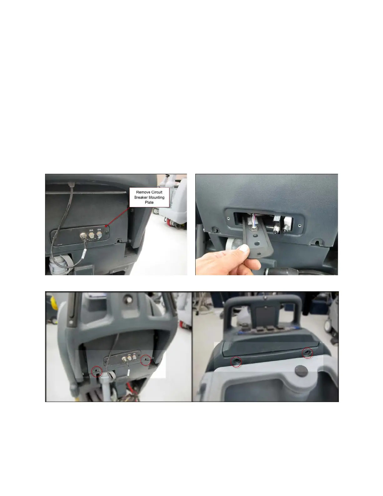 4. Remove circuit breaker mount plate screws. Parally remove plate. Remove breakers from plate, then turn plate