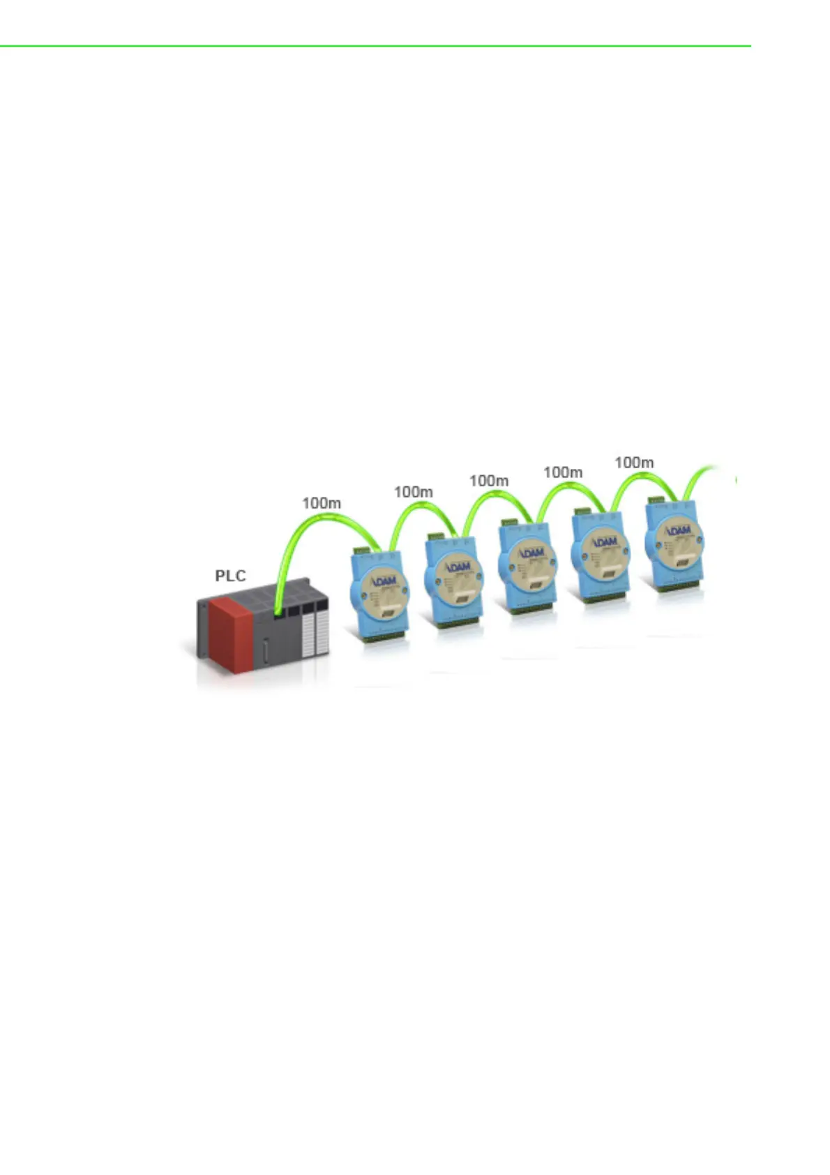 ADAM-6100PN series modules can be daisy-chained in an Ethernet network, making