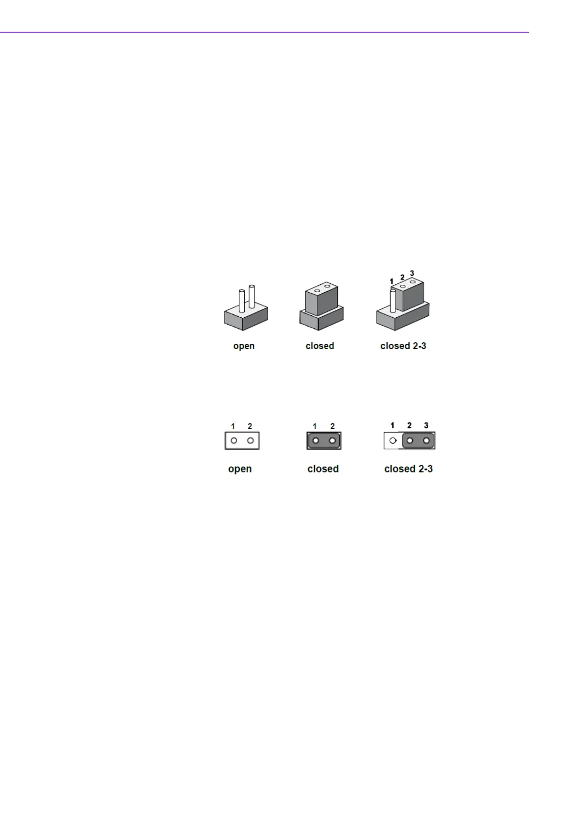 the pins to connect them. To close a jumper, connect the pins with the clip. To open a