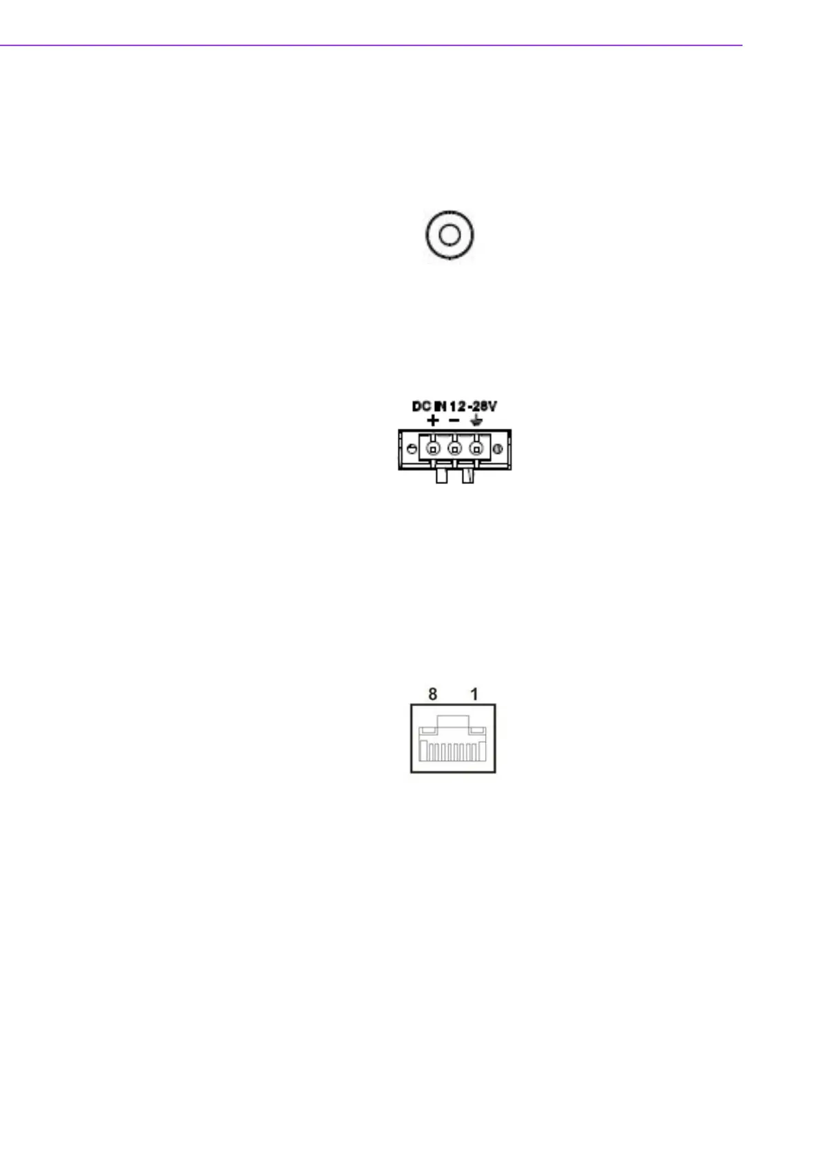 The power input connector supports 12 ~ 28 V. The 3 pins are defined as +, -, and