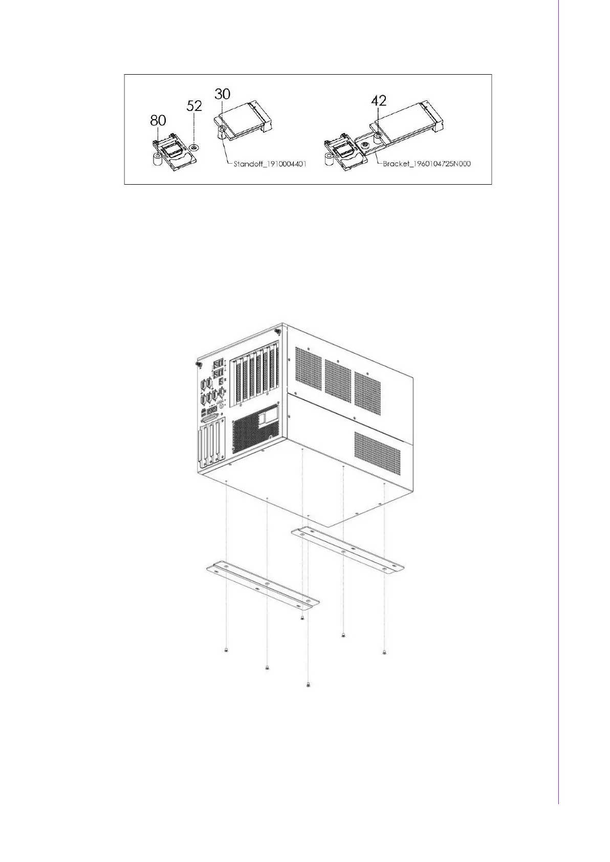 2. Fasten 3 screws and brackets on the left and right sides of the bottom, be