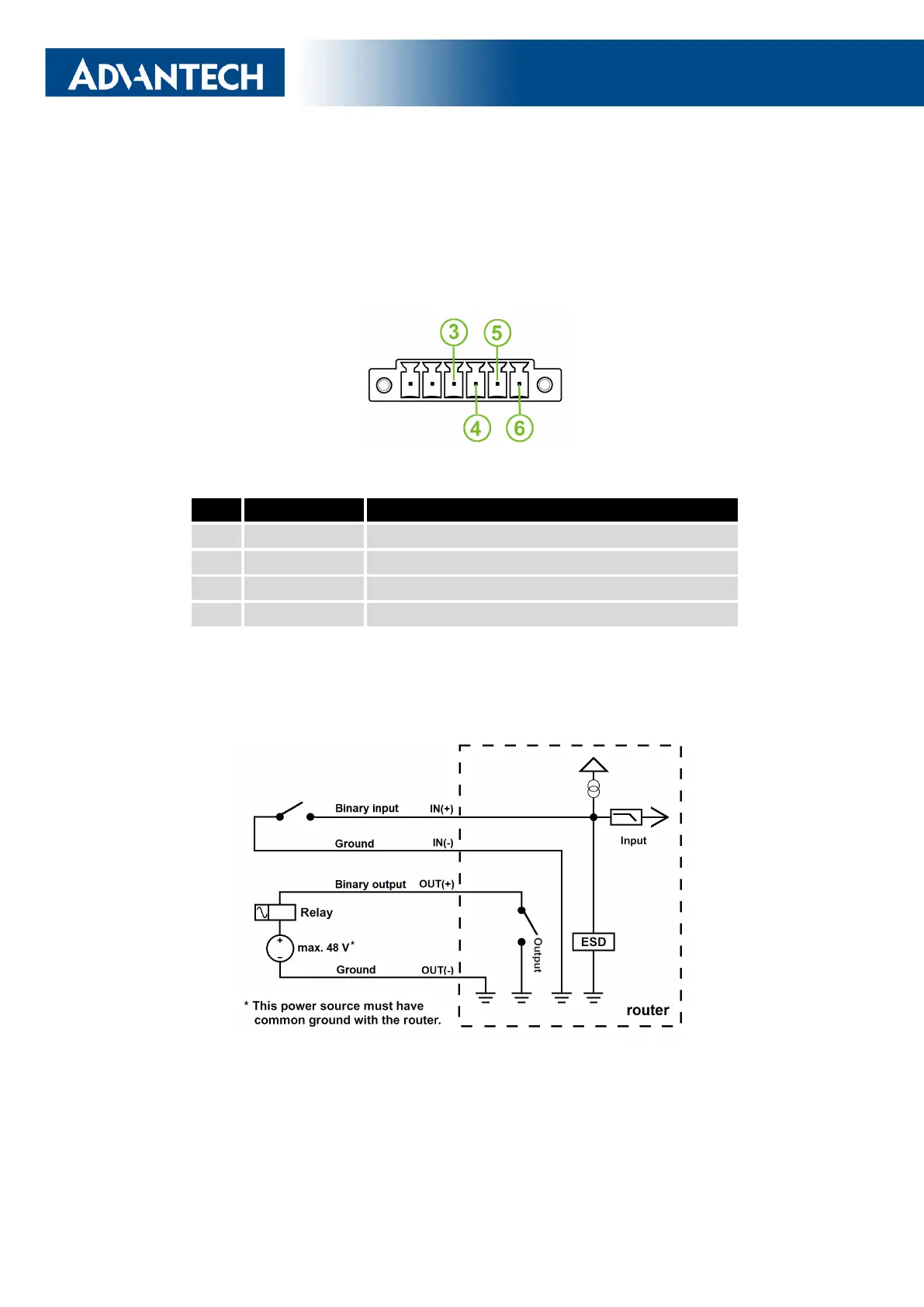 located on the left panel. The pinout of one binary input and one binary output is shown in