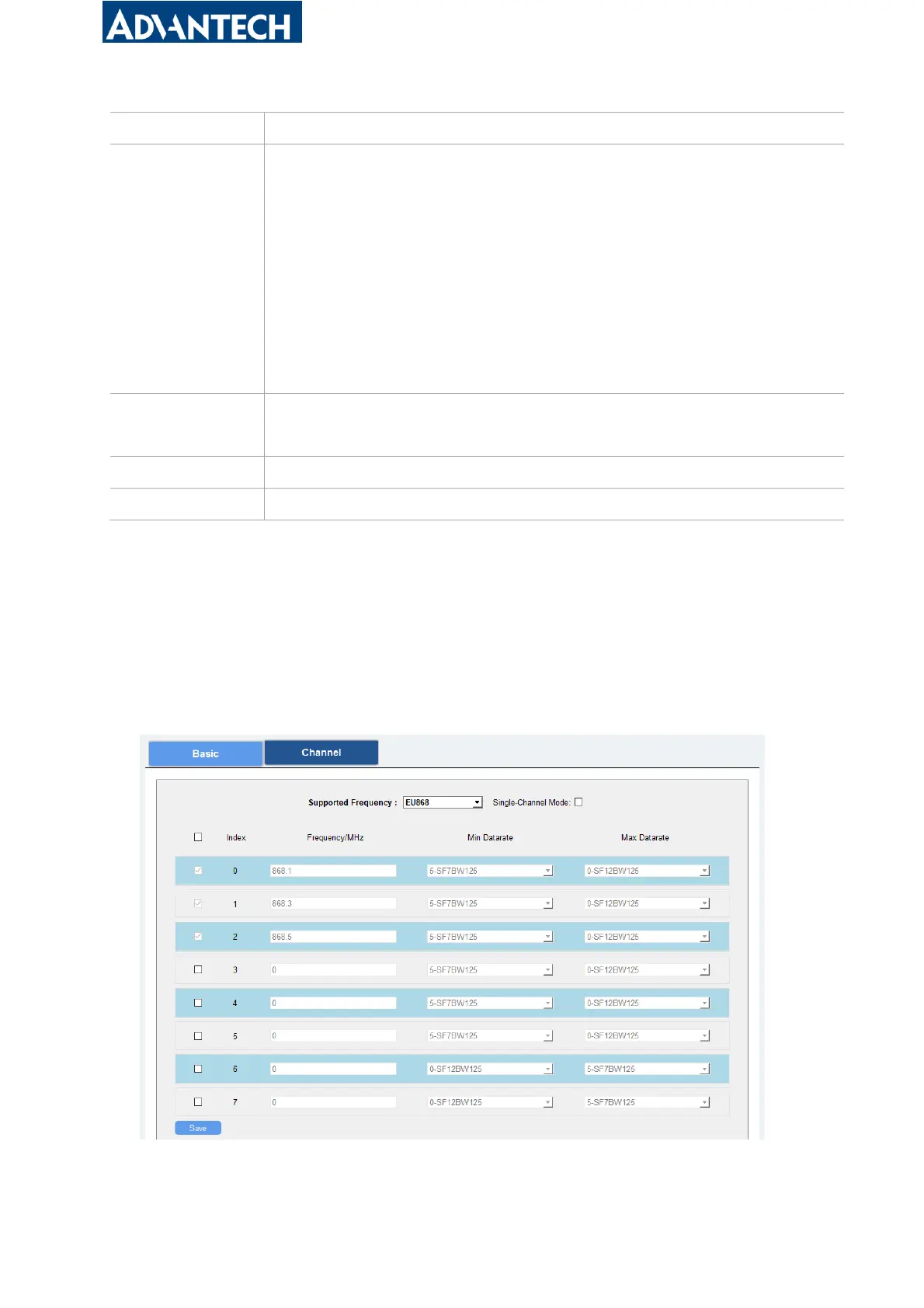 Go to LoRaWAN Settings > Channel to select supported frequency and select channels to