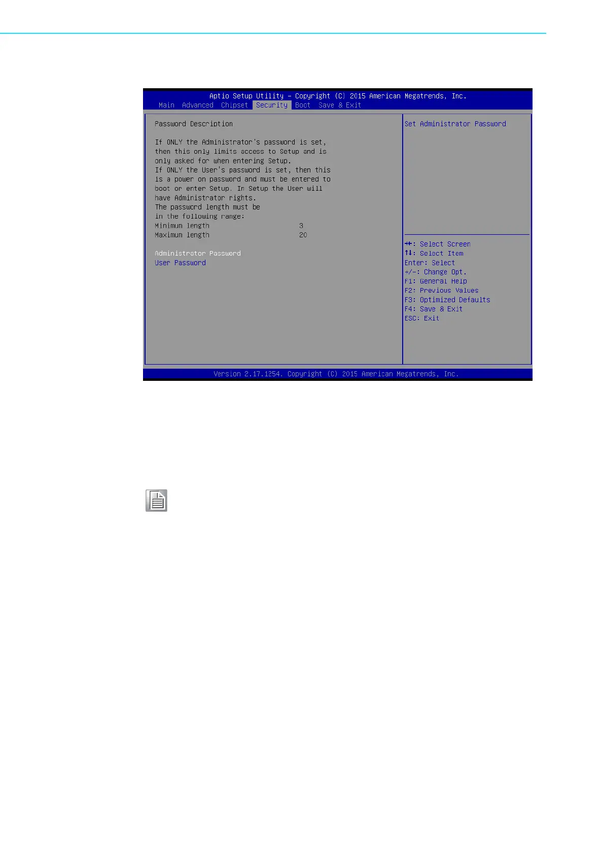 Select Security Setup from the MIC-770 V2 Setup main BIOS setup menu. All Secu-