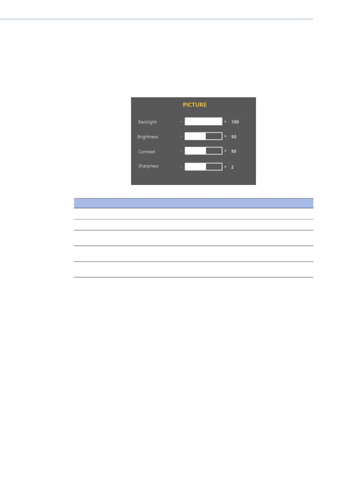 Backlight Used to adjust the backlight luminance. 100