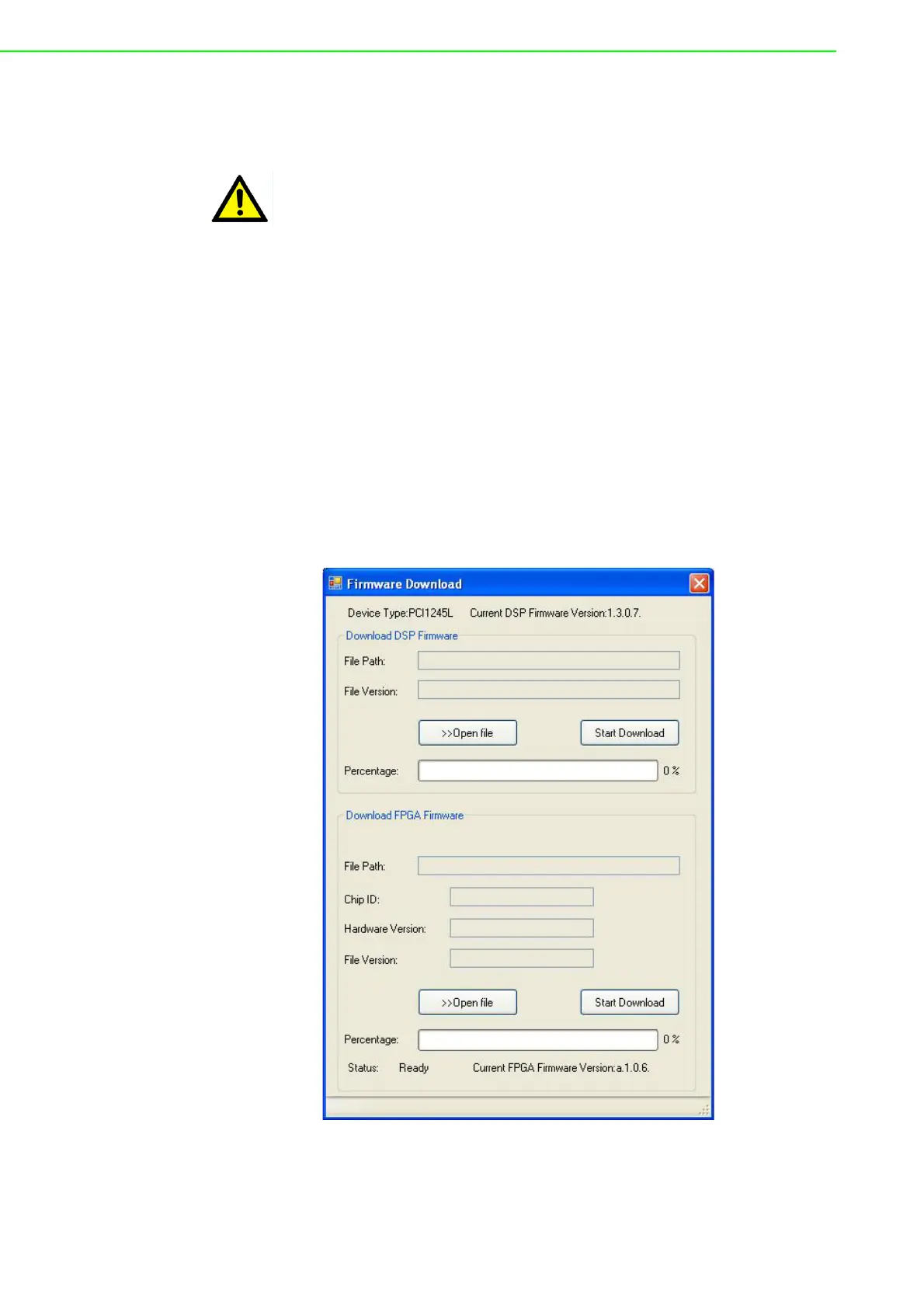 该工具按钮可实现 FPGA Firmware 的下载。PCI-1245L 无 DSP Firmware 下载功能。需