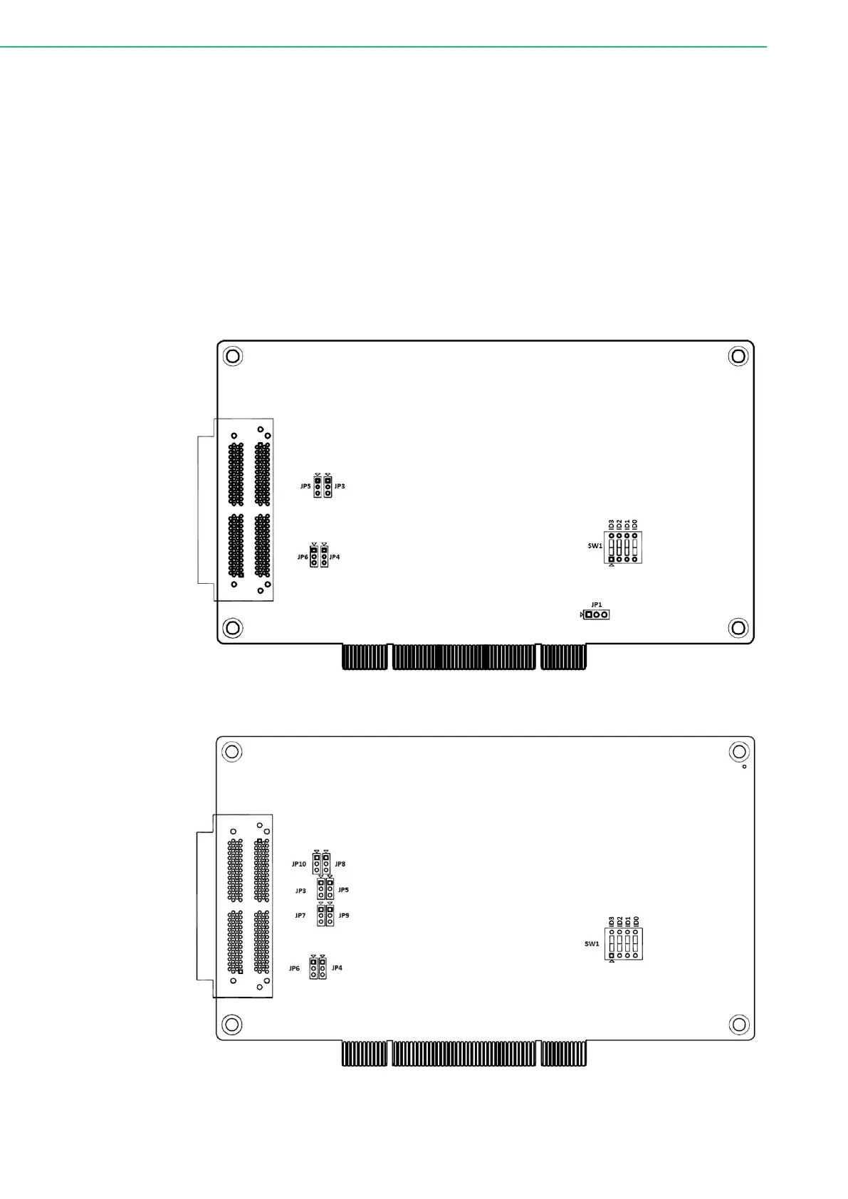 Figures 3.1 to 3.3 show the connector, jumper, and switch locations on PCI-1758