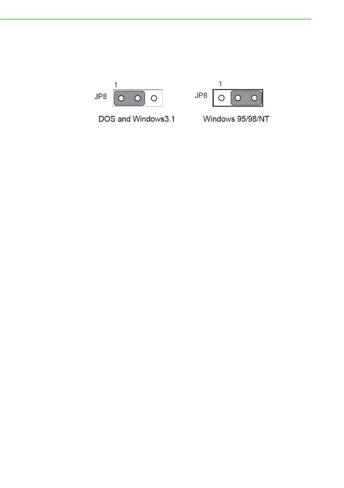 Connect the left two pins of JP8 to operate in DOS or Windows 3.1 mode, as shown