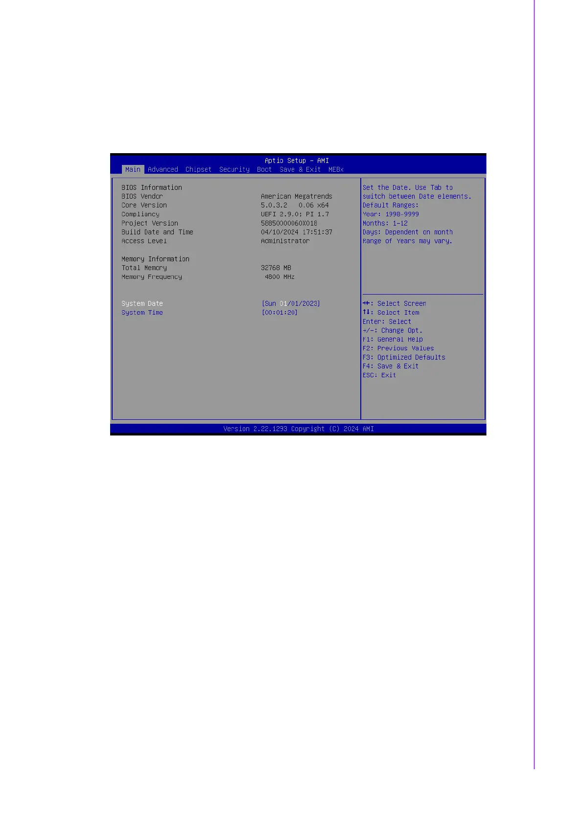 System Date using the <Arrow> keys. Enter new values through the keyboard.