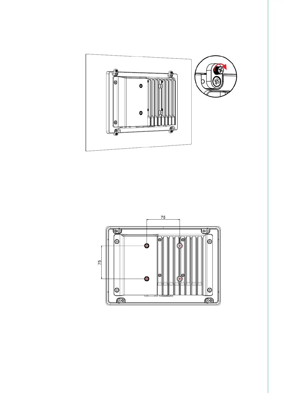 TPC-310W 的後蓋上有 4 VESA 安裝孔(75 x 75 毫米)VESA 安裝套件需要