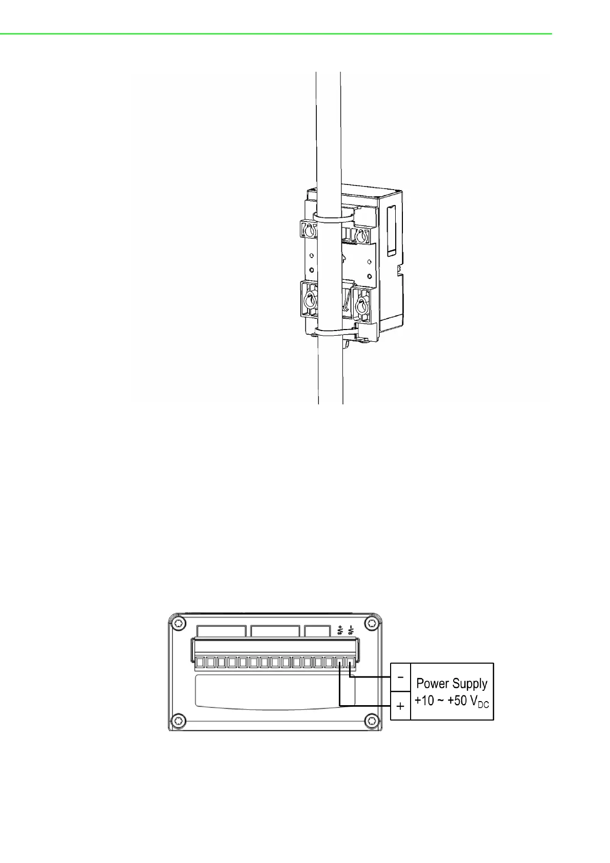 be maintained between +10 and +50 VDC. The screw terminals labeled "+Vs" and "-