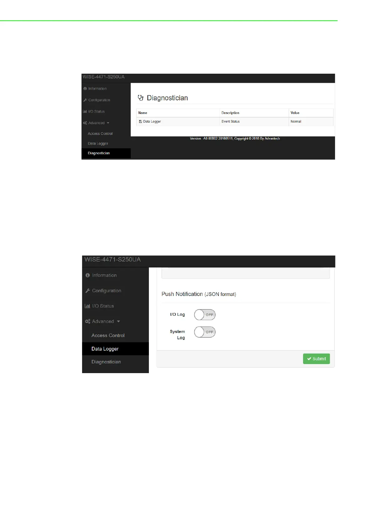 The Diagnostician page indicates the operating status of the WISE module. The sta-