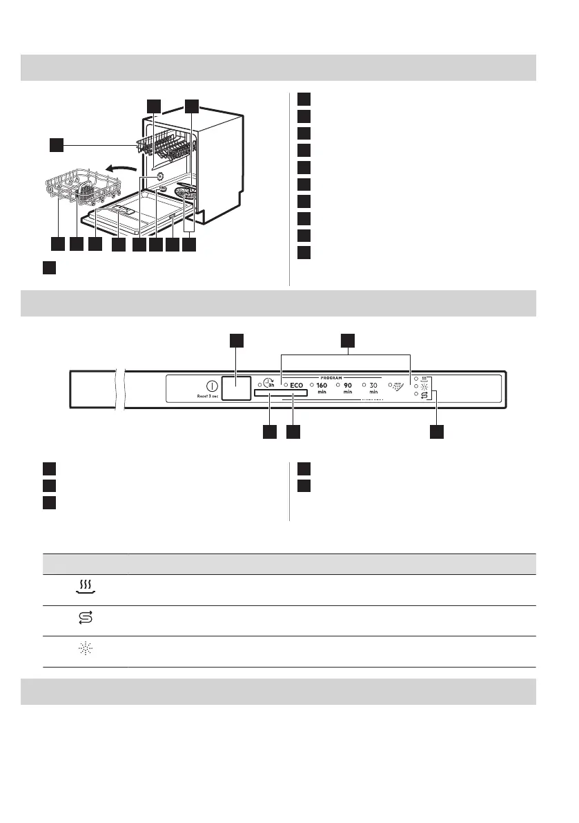 Rinse aid indicator. It is on when the rinse aid dispenser needs refilling. It is always off while