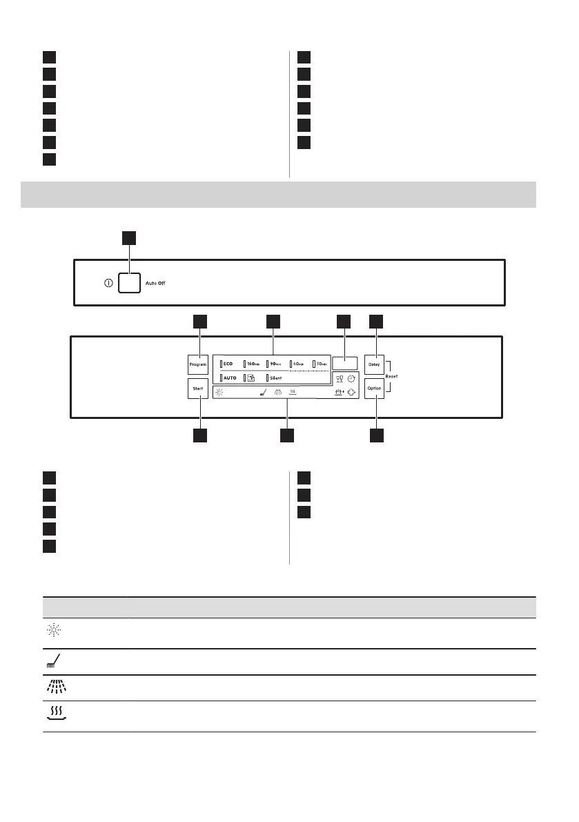 Rinse aid indicator. It is on when the rinse aid dispenser needs refilling. It is always off while