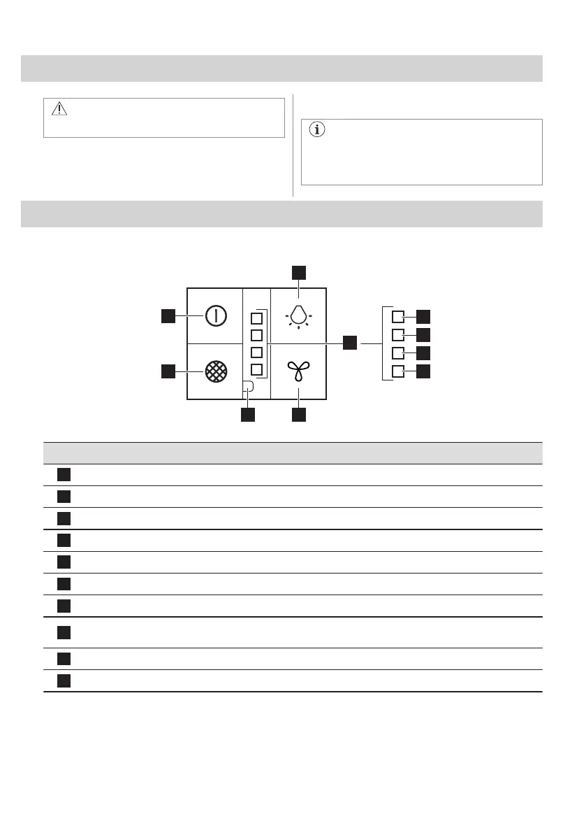 Indikator for ventilatorfilter Minner deg på å skifte eller rengjøre kullfilteret og rengjøre fettfilteret.