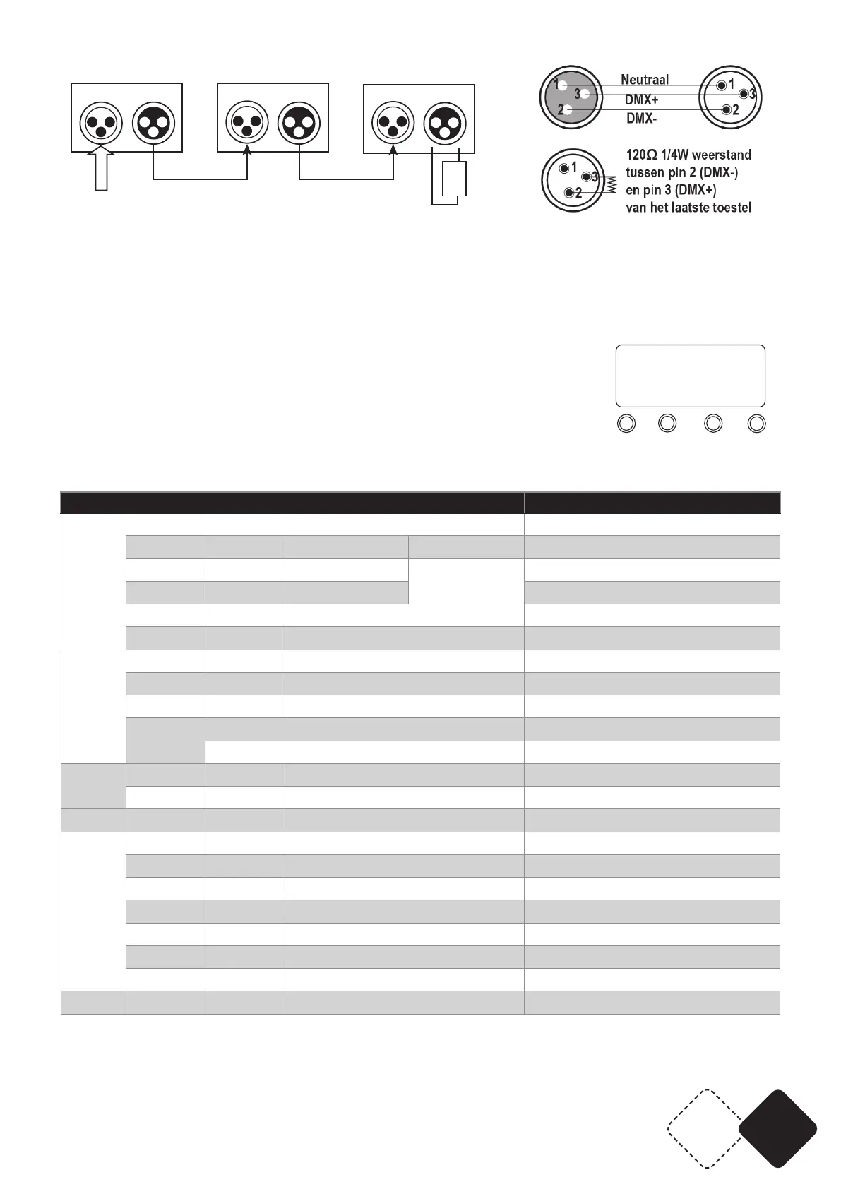 De DMX Kanaalstabel zie aan het eind van de handleiding