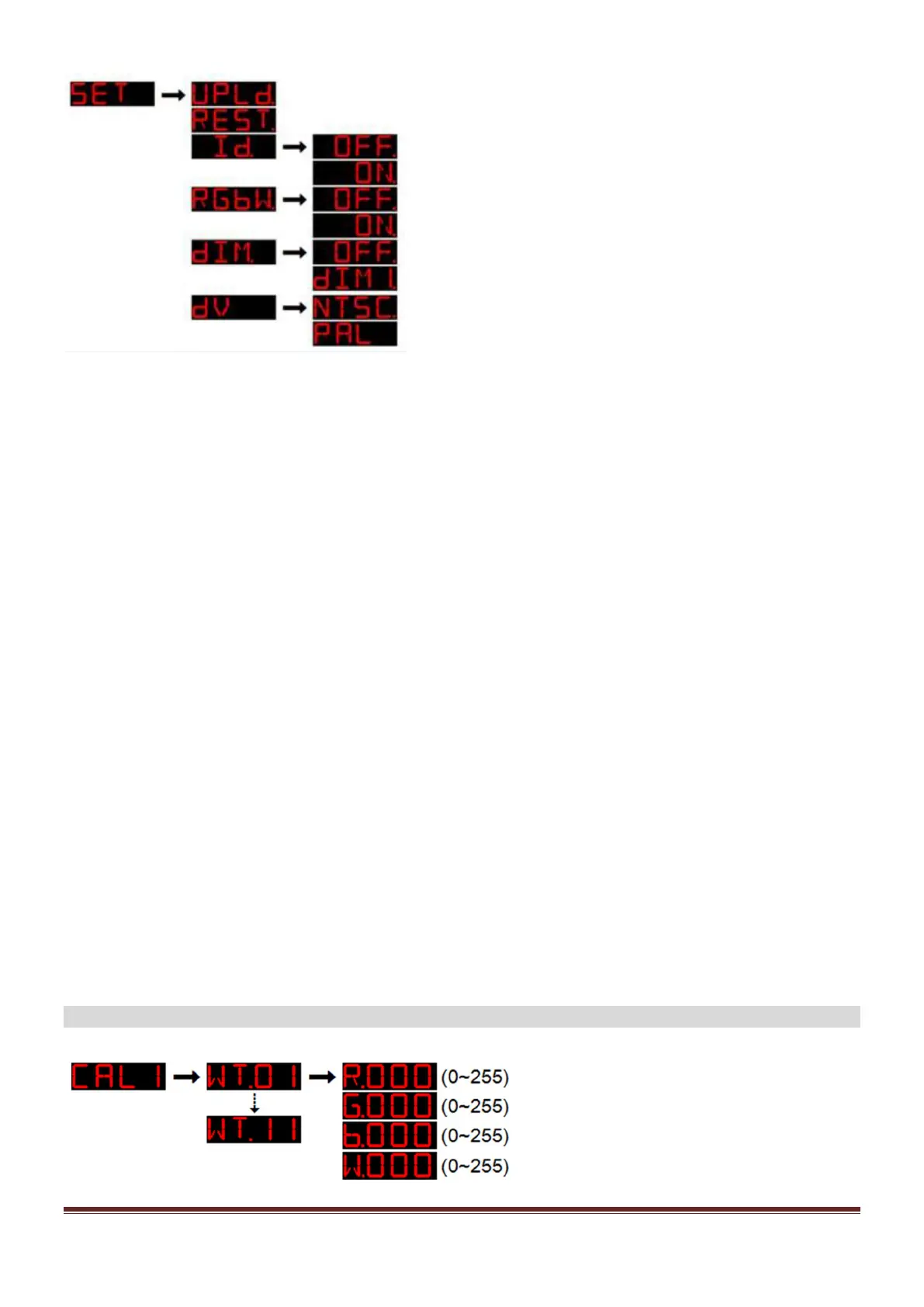 【RGBW】: Ajuste de corrección de los colores.【ENTER】, Apriete en【UP】/【DOWN】para seleccionar【ON】 para