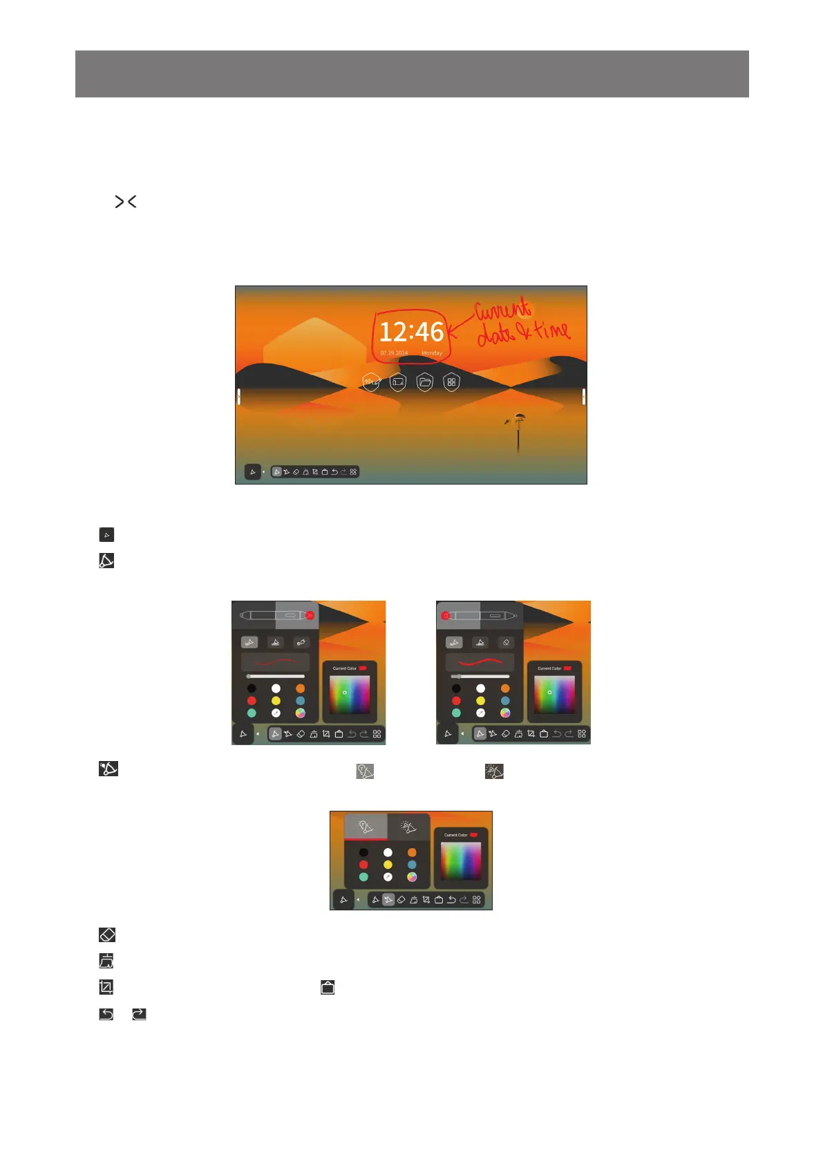 Write or draw on the screen directly with your nger or with the touch pen. To change the text/drawing color,