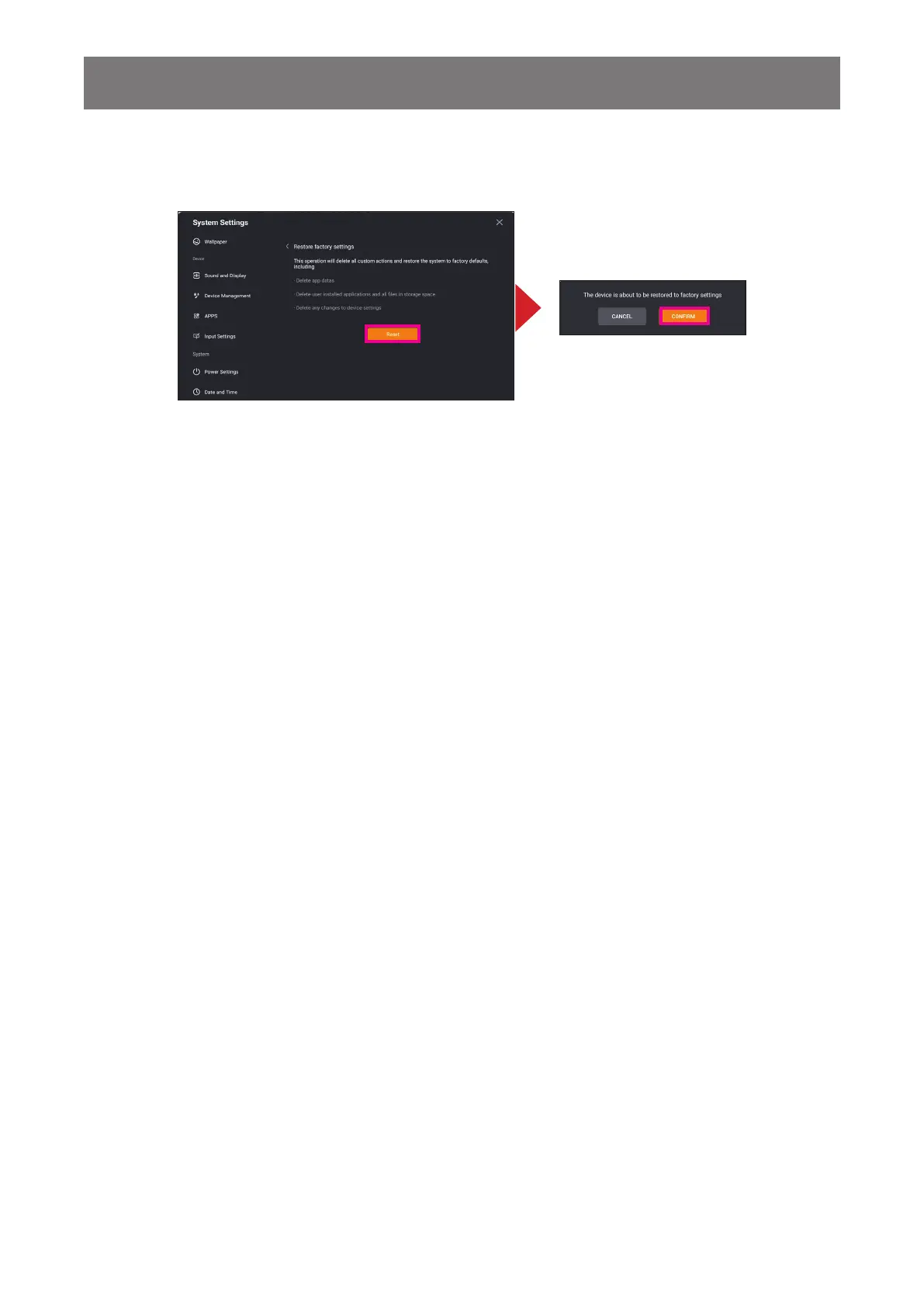 to factory default. Touch Reset and then touch CONFIRM at the prompt to proceed with resetting