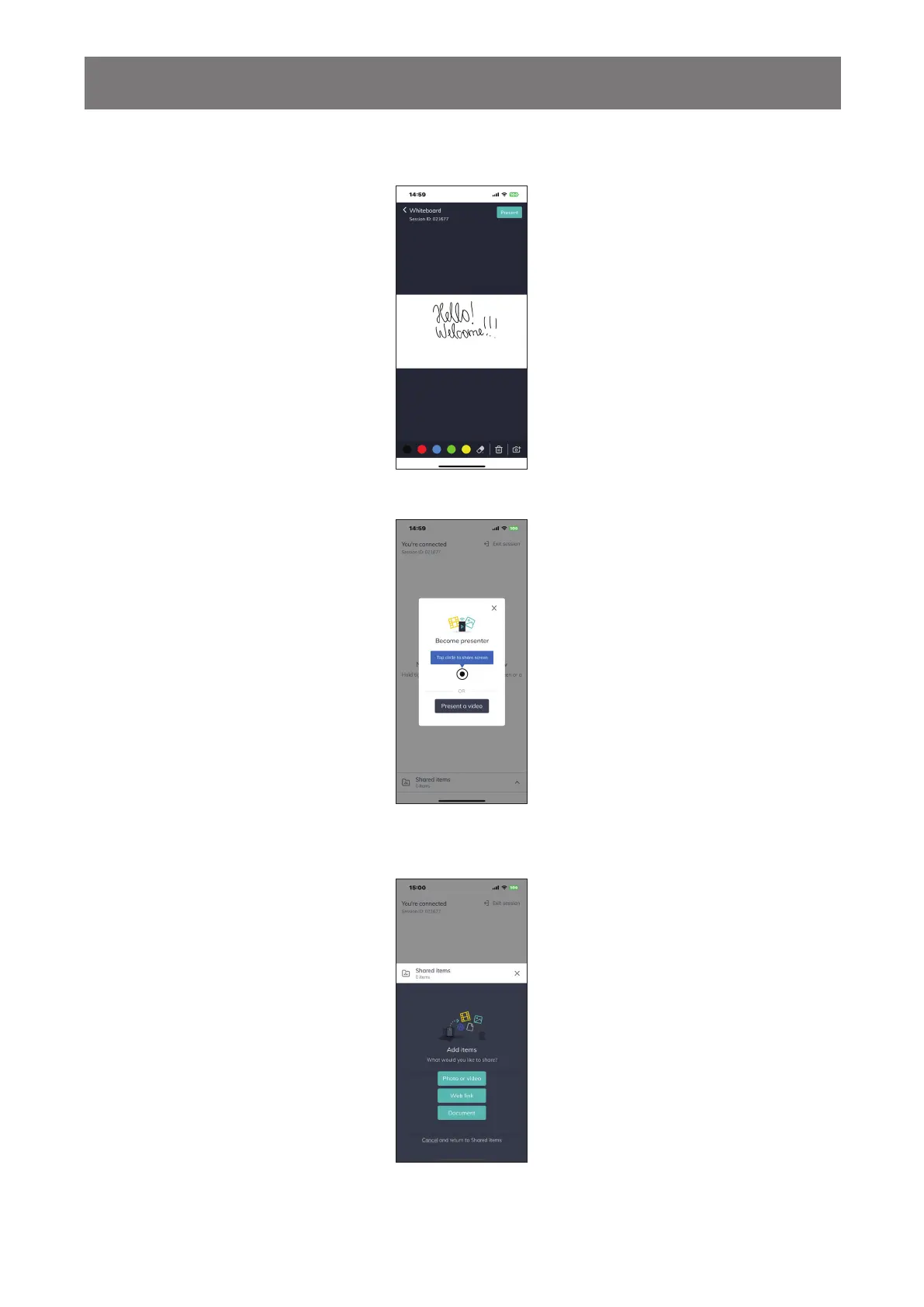 - Shared items: View and share items. Touch +Add items to upload items for sharing or touch on