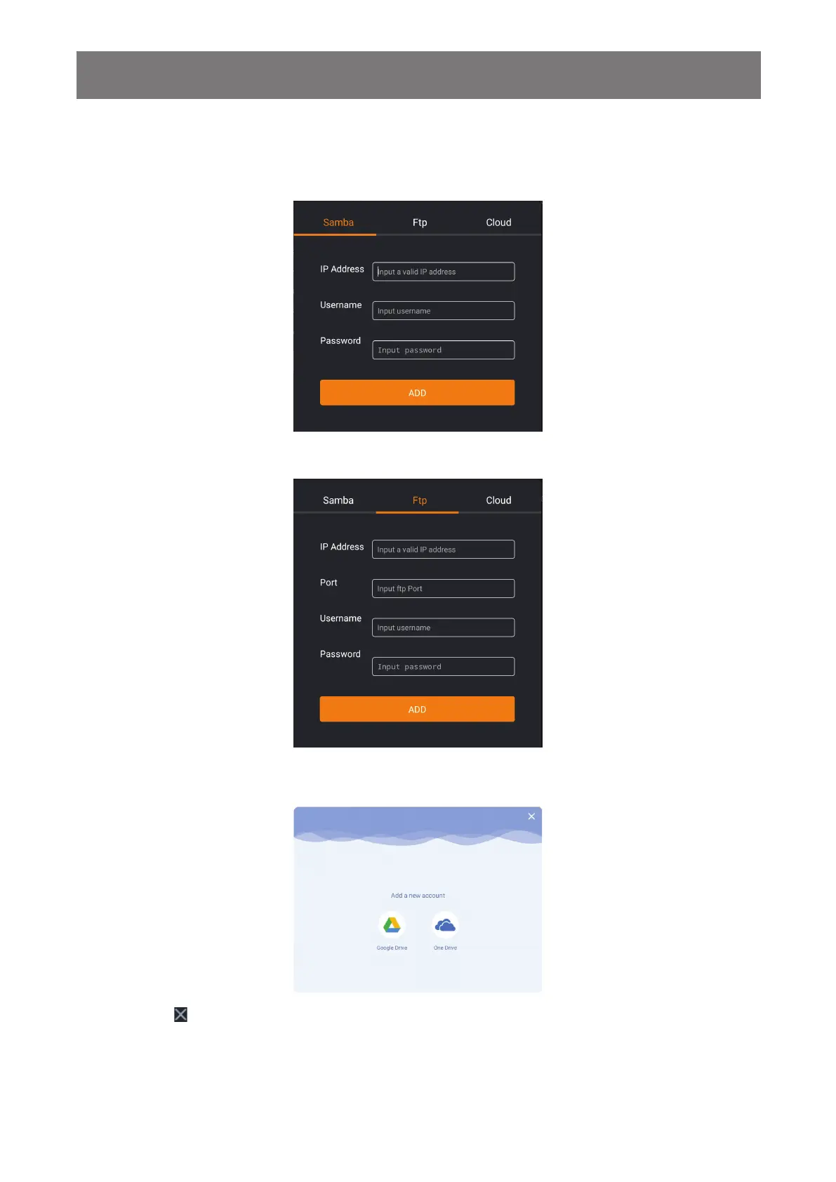 - Ftp: Enter the IP address, port, usename, and password. Then touch ADD to access your FTP