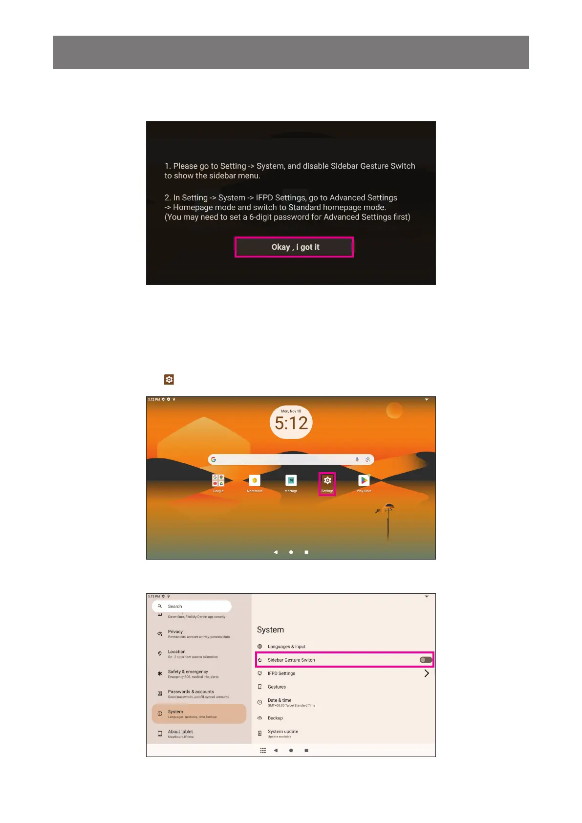 2 In the Settings menu, touch System. Then disable the Sidebar Gesture Switch.