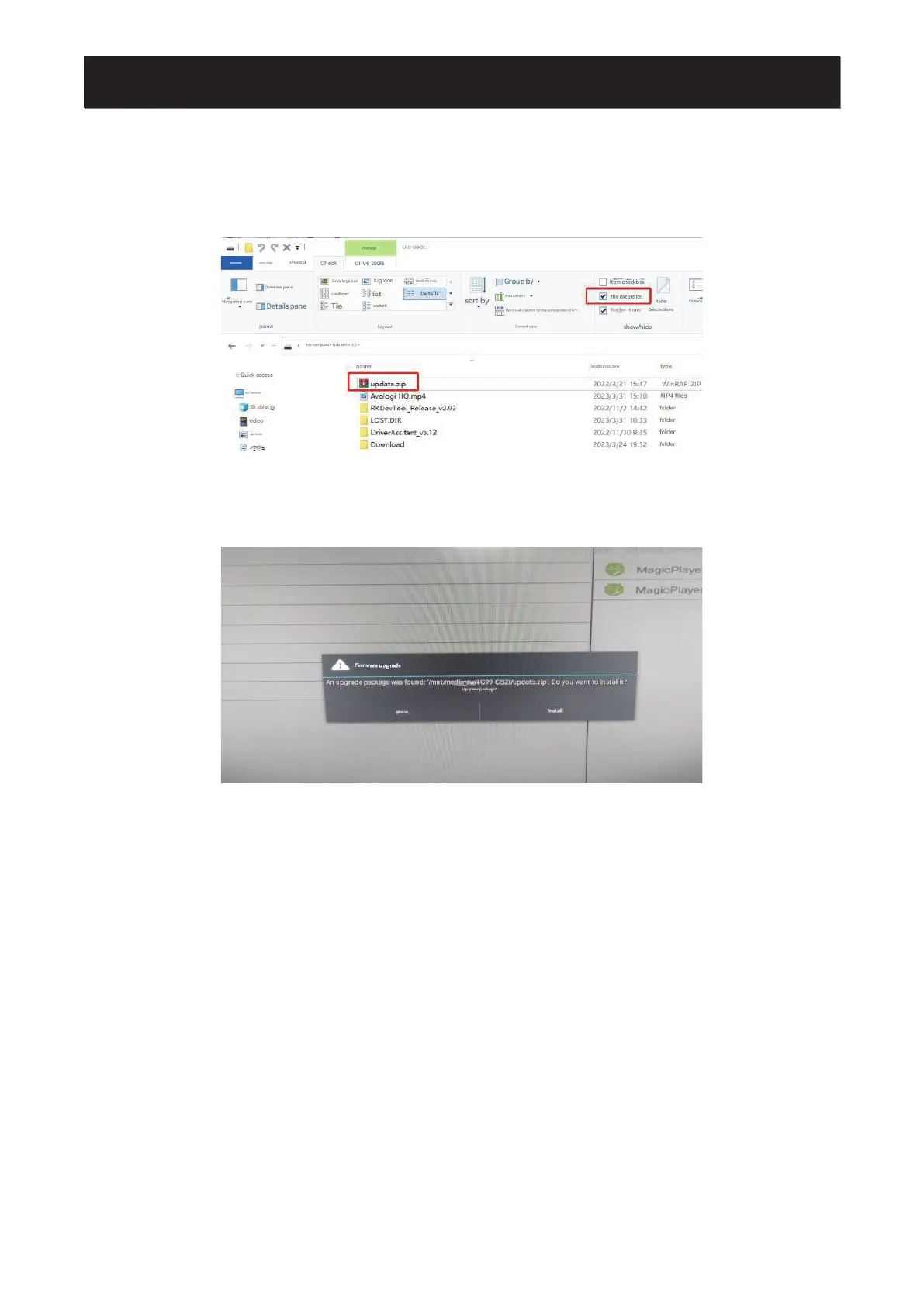 Step1: Name the upgrade le “update.zip”, put it in the root directory of the USB drive.
