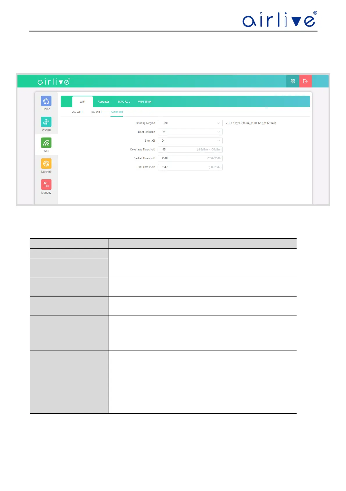 Advanced Settings allows to change the parameters of the CPEs. Country Region lets you select there different Wi-Fi