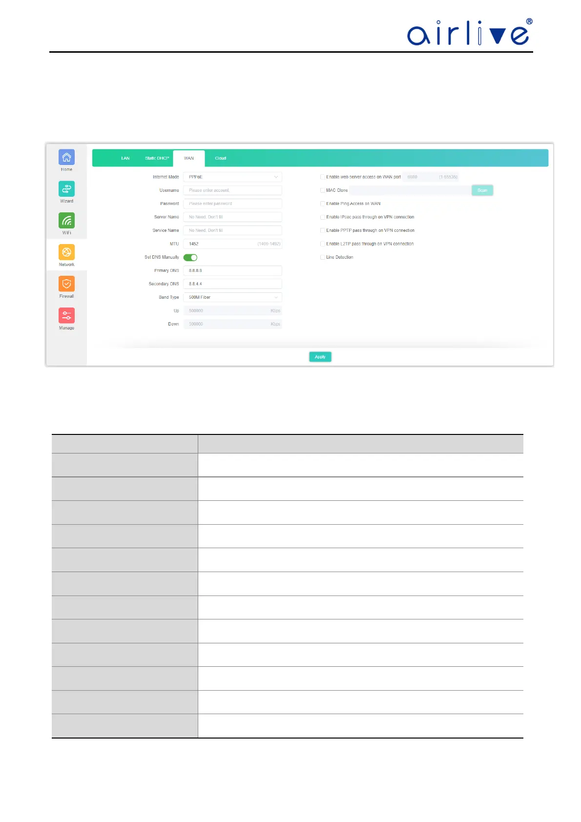 The default setting for the WAN port is DHCP. Select PPPOE if your ISP is using a PPPoE connection and provided you
