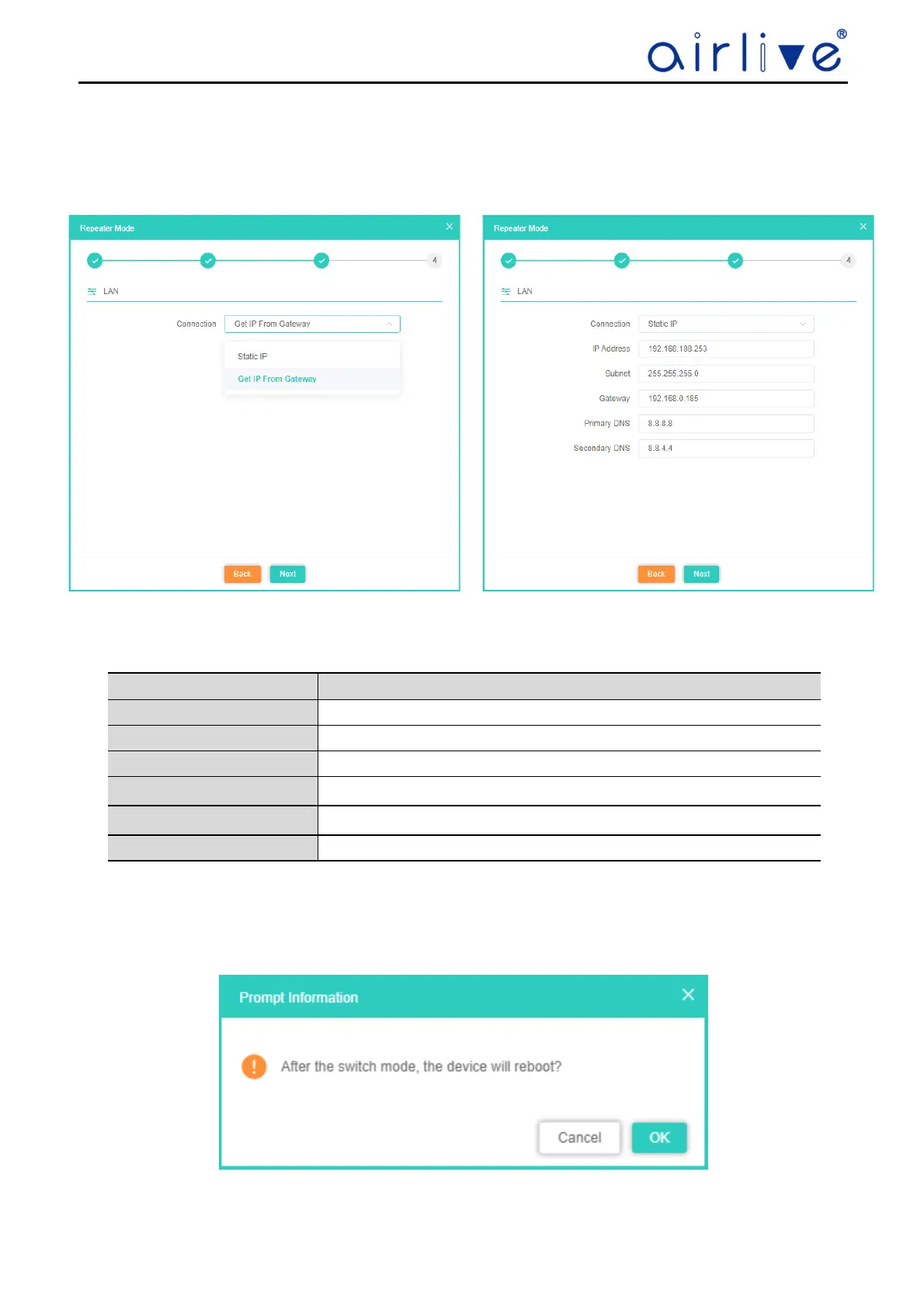 Connection Select “Static IP”, “Get IP from Gateway” for setting up device IP.
