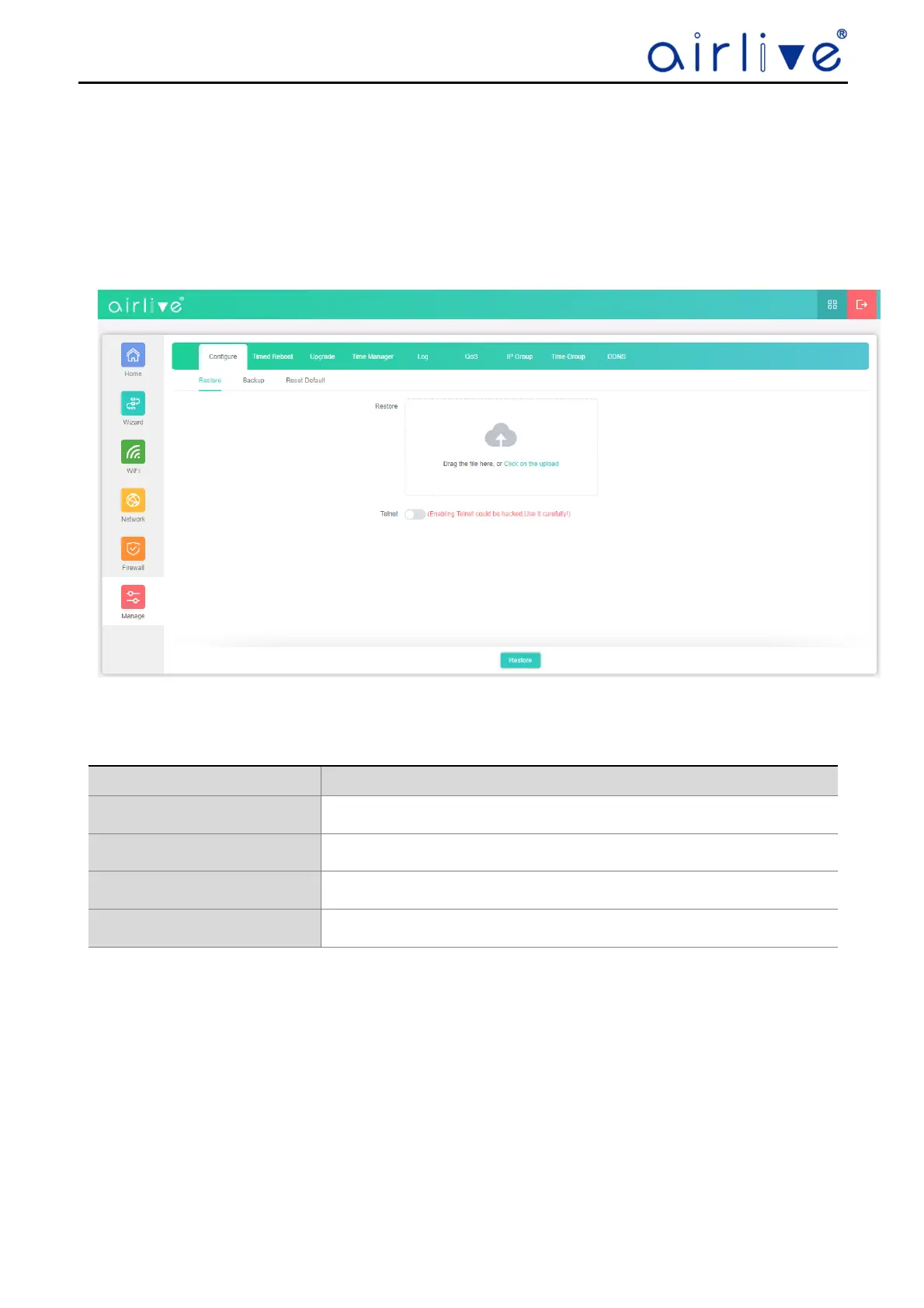 The Management page allows for a backup, reset or upgrade of the CPE. Note that there is a difference between AP
